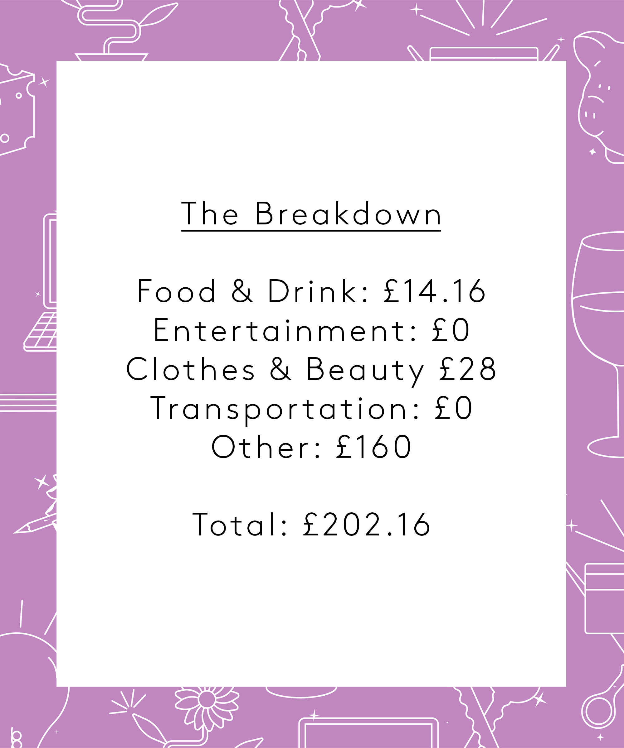 “Aside from the carpet, this has been a fairly typical weekly spend for me during lockdown. Now that I’m working from home, I’m not spending money on transport or buying lunch and treats once or twice a week, so I knew I would be able to pay for the carpet without using money from my savings. Looking back at my diary, I can see how much more interaction I am having now that I’ve been able to make a bubble with my parents. The first few months of lockdown have been difficult on my own, and it’s made a huge difference to how I feel now that I can spend time with people. Lockdown restrictions are easing soon but I can’t see that having an effect on my spending as I don’t plan on going to the pub or restaurants for a long time yet. Although it might be a good idea to go out and eat something other than chicken! A drink with the office crush wouldn’t go amiss either.”