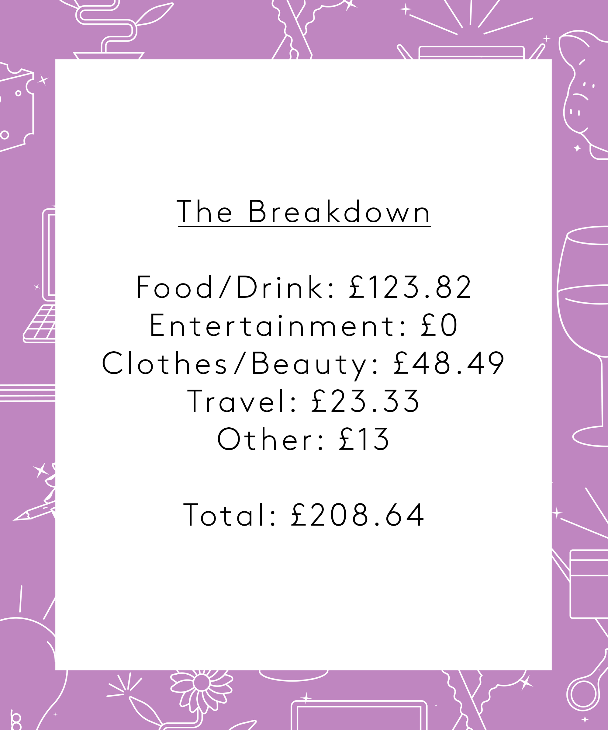“I think this was a fairly average weekly spend for me. I always knew food and drink would be my biggest spend but I think it’s kinda shocked me just how much I would probably spend on average! I’m definitely adjusting to being out of lockdown and living back in London nearer my friends again. I went from spending so little during lockdown to now spending a lot more again. I think particularly because it’s been months since I’ve seen some of my friends, I am trying to do the most that I can with them at the moment. I’m definitely going to try and pick cheaper options for bars and restaurants moving forwards! While it may look like I’ve met friends a lot this week, I’m still trying to be as careful as possible. I would say that this is reflective of how social I normally am, as I really value spending time with my friends, so it’s just been adjusted to the current circumstances.”