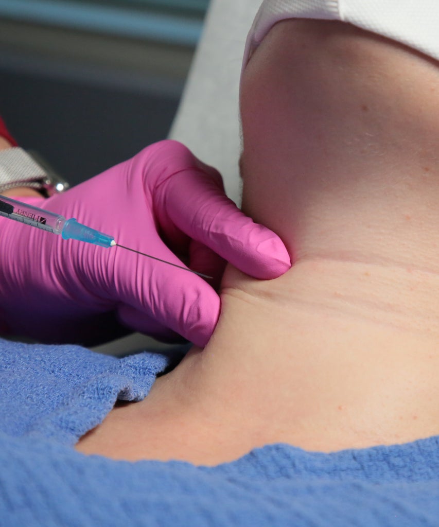 Dr. Durairaj started the procedure by numbing her client with lidocaine at the injection site. Once the area was numbed, she proceeded with the filler. “One syringe per neck line is typically required,” Dr. Durairaj says of the procedure. “The filler needs to be carefully placed to where it’s visible enough to fill in the lines, but not too superficial where we see visible bands of filler along the neck.”