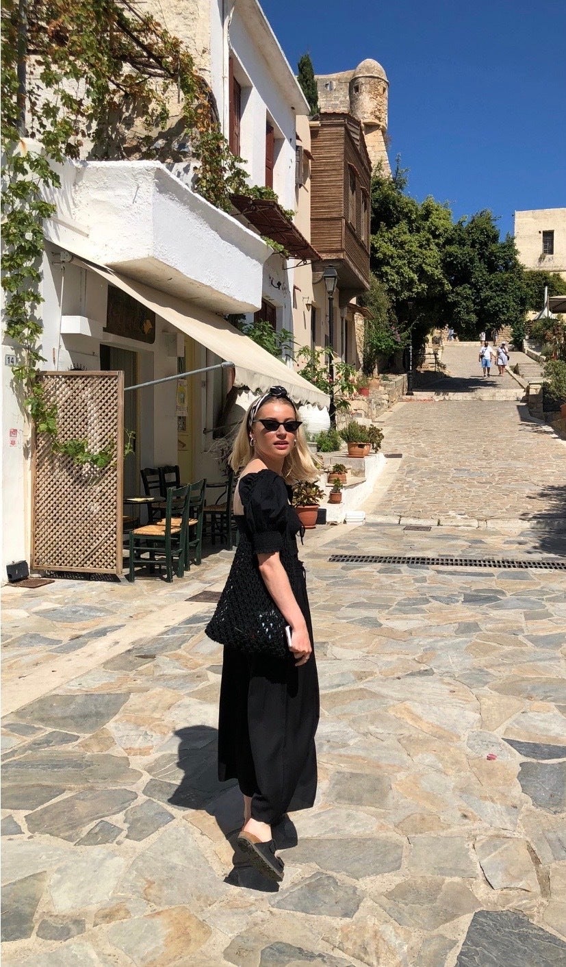 I only started wearing dresses last year but I’d love to expand my summer collection. I’m not a fan of floral print or much colour, so this black linen dress is the one. I’m into the side split, fitted bodice and pretty ruched sleeves.