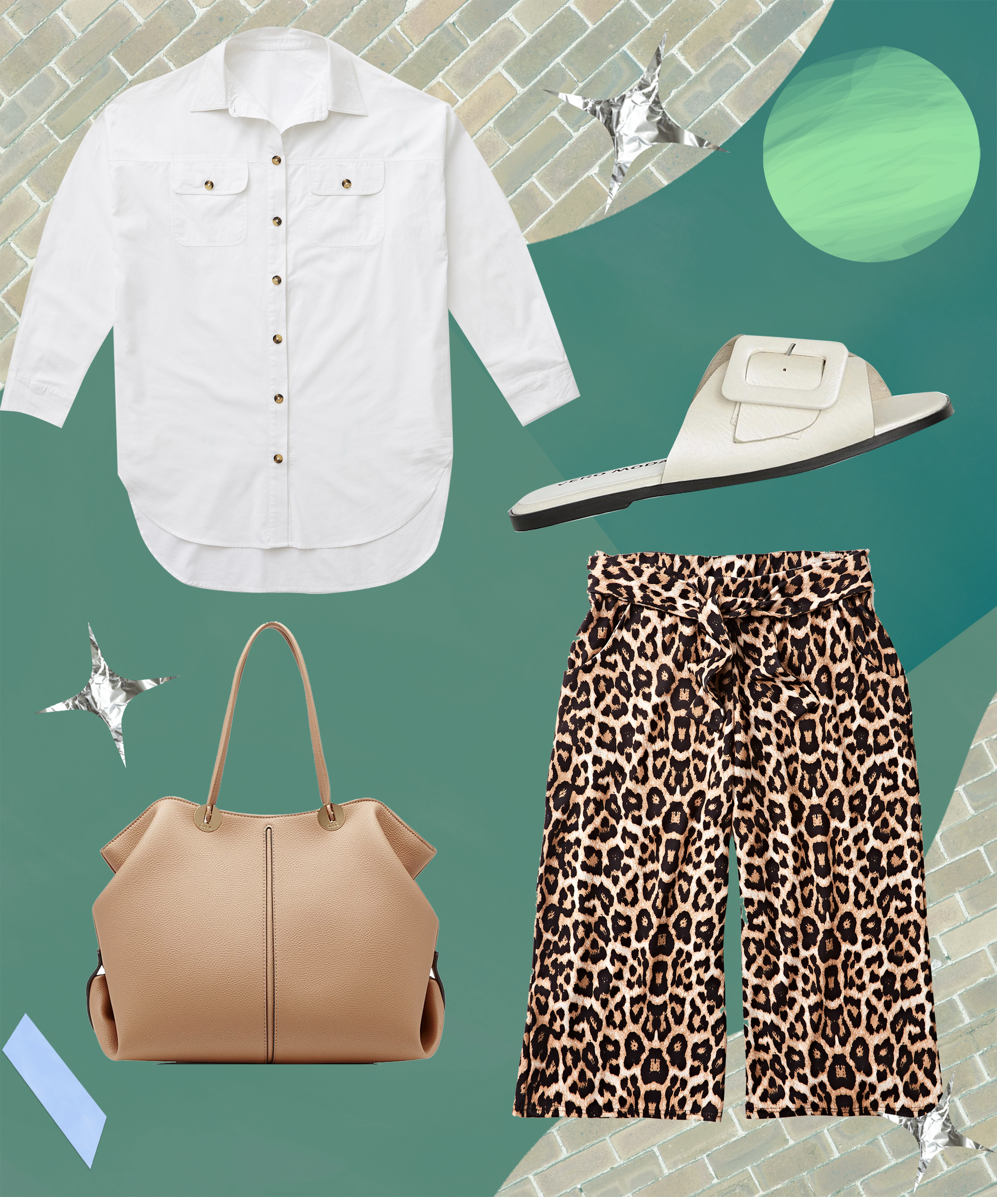 Leopard print is a winner for any occasion, TBH. It’s a bold print that’ll do all the talking for you, not to mention one that doesn’t require much excess styling. Paired with a longline poplin top, you’ve got smart-casual at its finest. White slip-on sandals and a camel-coloured hobo bag are just the right finishing touches: sandy, sunny and smart.