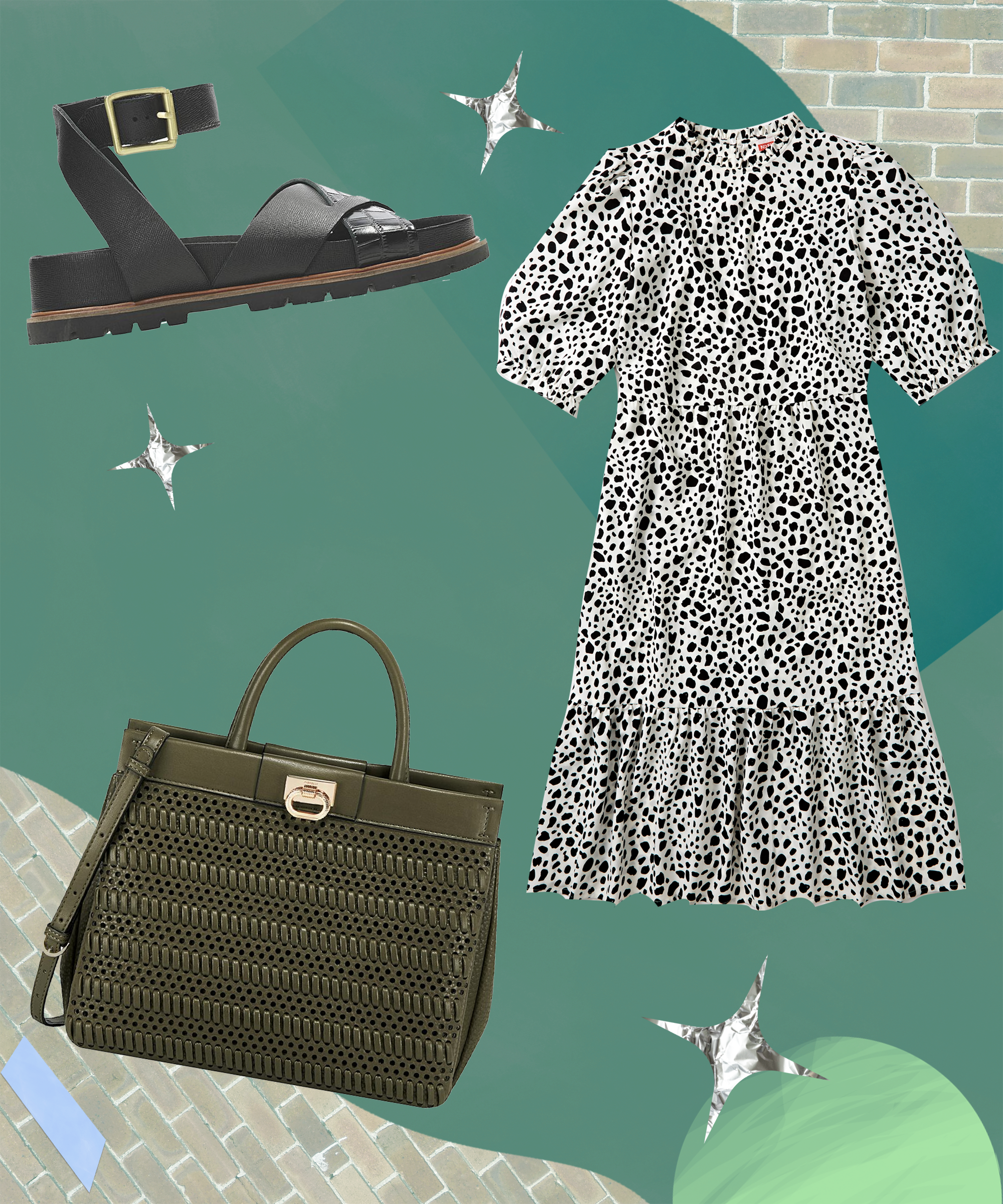 A khaki-coloured grab bag and black leather sandals would look right at home on a Wednesday morning commute or on a woodland walk that same afternoon.