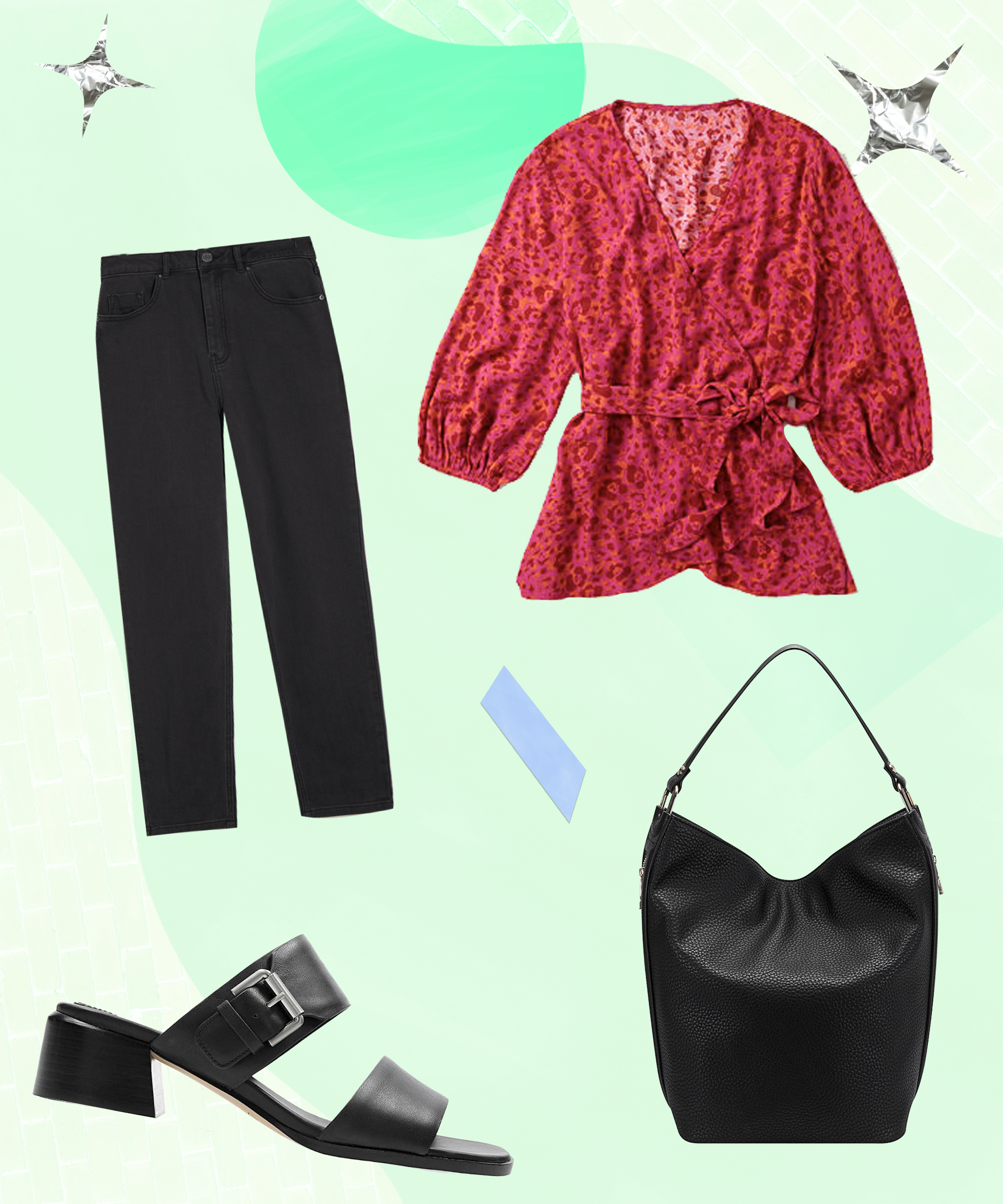 We suggest keeping your accessories simple to make this statement look pop. A pair of coral-coloured slip-on sandals and a black faux leather bag will show onlookers that you’ve got this.