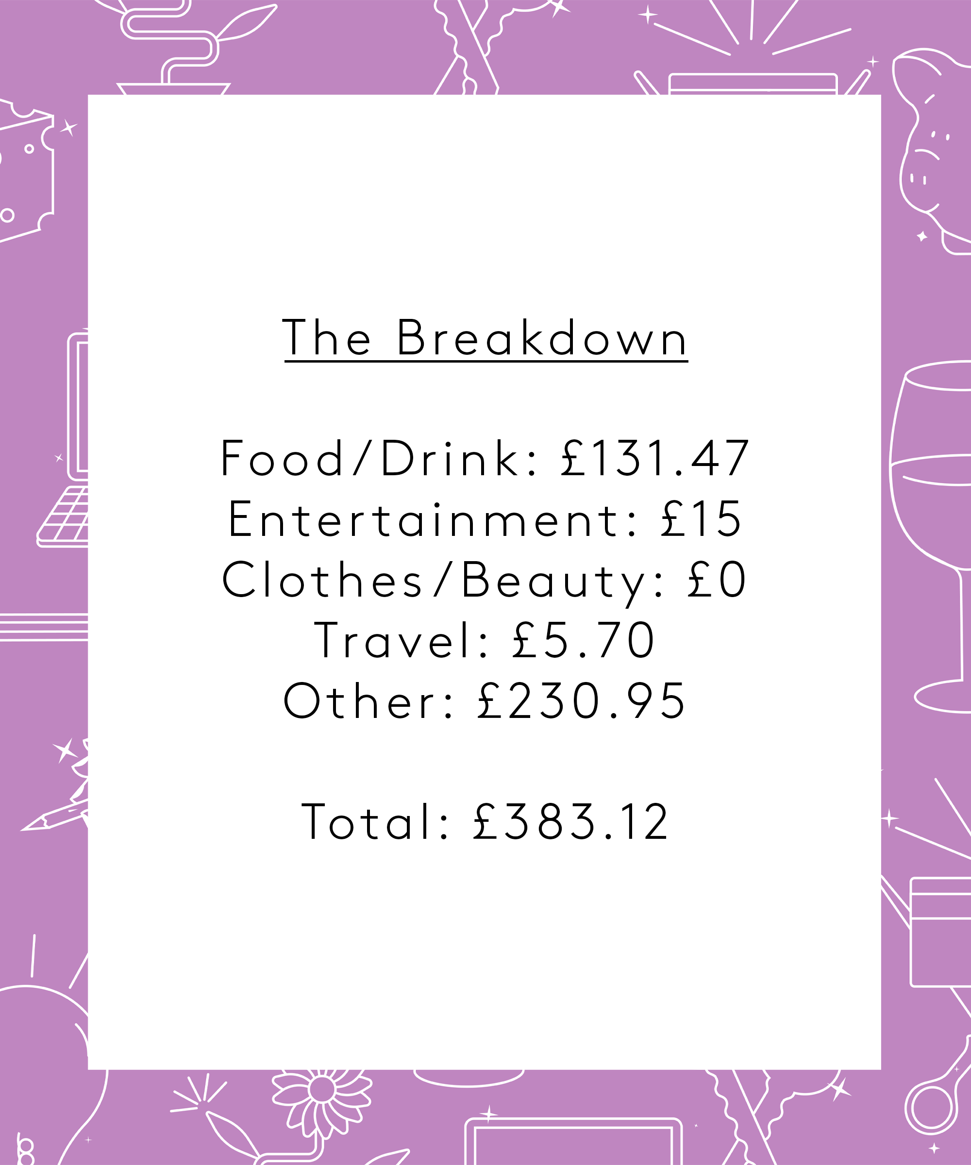 Public transport: I’m currently spending approx £20/m on Tubes (in normal times, I would spend about £100. I have a Young Person’s Railcard attached to my Oyster card so I get a third off travel off-peak.