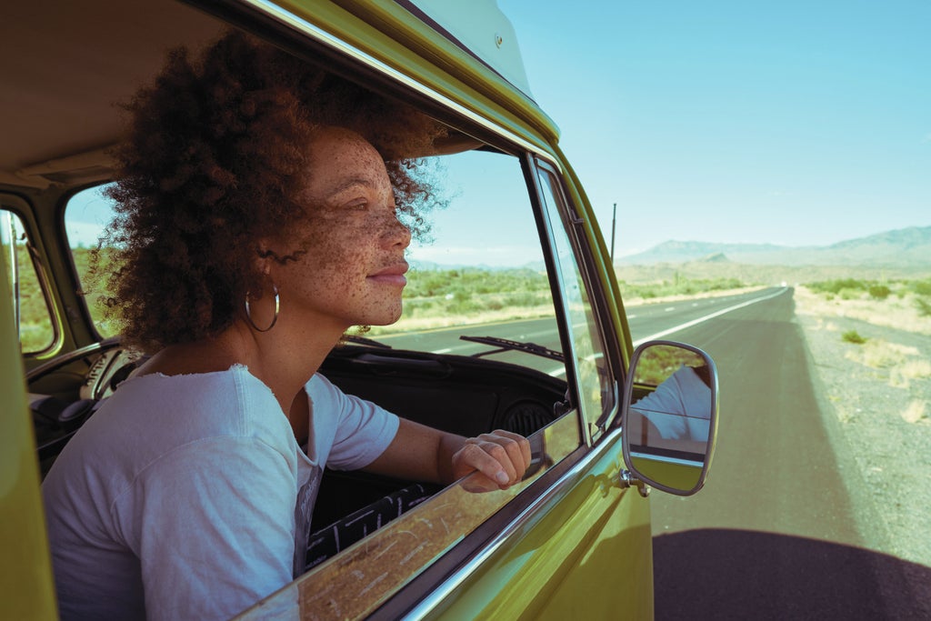 In 2017, 33-year-old Los Angeles-based photographer Devyn Galindo purchased a VW Camper. Its exterior was a gorgeous olive green – real ’70s style – and Galindo (who goes by both they/them and she/her pronouns) nicknamed it Sweet Pea. Within no time, they had transformed it into a travelling studio and it has been an integral part of their life and work ever since. “I wanted to be able to hit the road and make projects across the US to document queer stories,” they recall. “I feel we are often written out of social narratives – especially queer POC folks – and I wanted to leave behind a project that documents our existence. I was travelling with a few cameras, and lots of rolls of film, and I started to photograph people in the van, around the van or in their spaces. Working and living out of a van is the kind of freedom that I always want to feel – to live simply and minimally and to connect with others has always been the dream for me.”
