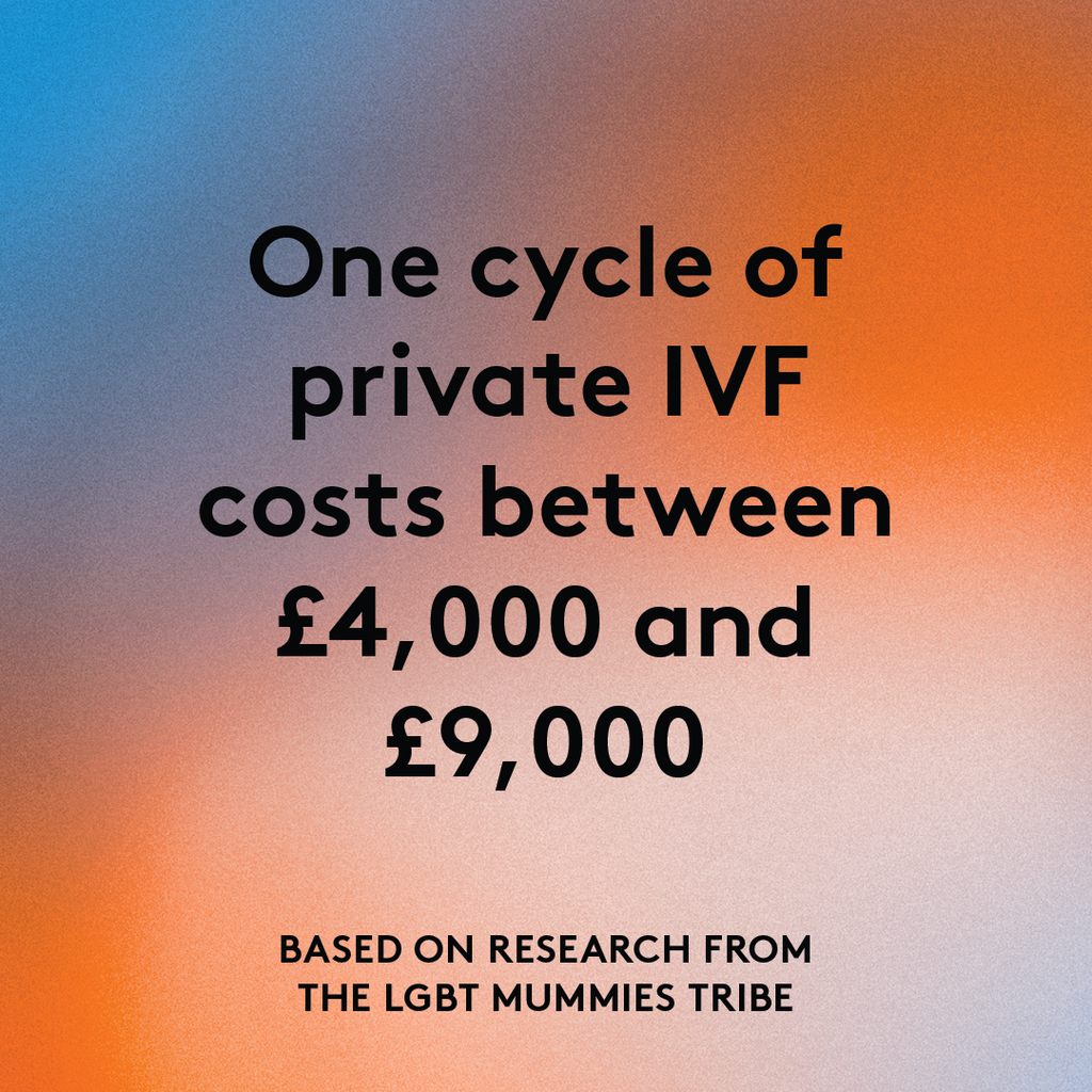 What we do know is that starting a family can be expensive. As well as the cost of sperm and the mandatory tests, each round of insemination costs between £800 and £1,300. Most CCGs require you to complete at least six rounds of IUI before NHS funding consideration for IVF. This will cost between £4,800 and £7,800. Private IVF is more expensive and costs between £3,100 and £4,000 per round according to the support network for queer parents, The LGBT Mummies Tribe, with medication (depending on what you need) costing between £600 and £2,500 per round.