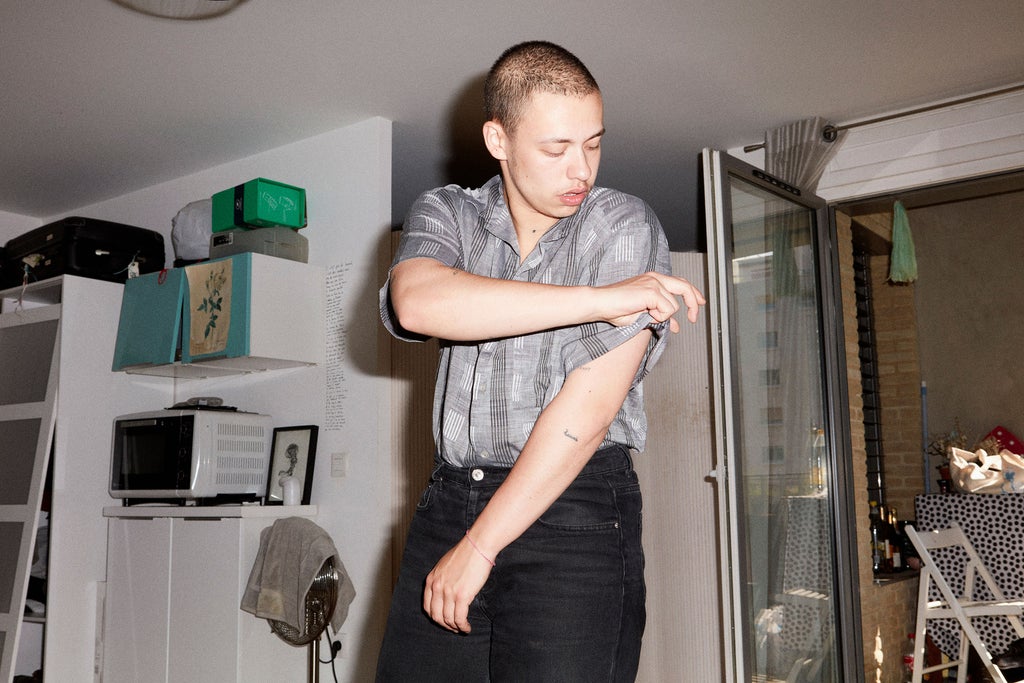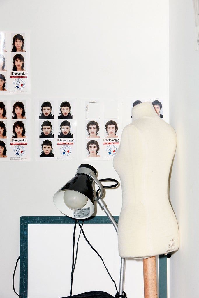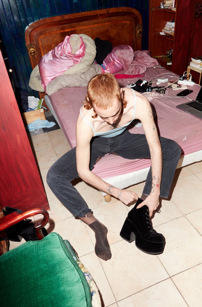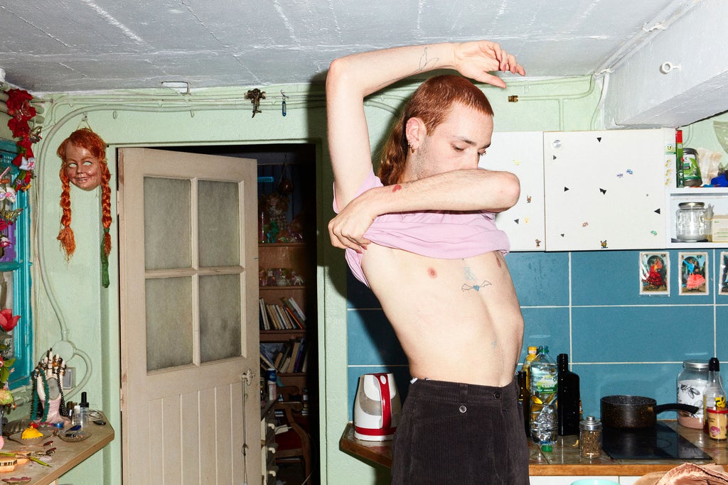 Later, he met Ava and Leo, Matthias and Maty. He points out a particular image of Matthias pulling a pink T-shirt over his head, arms up, revealing a little tattoo of a heart with bat wings in the middle of his chest. Behind him, a mask with hollowed out eyes and bright red plaits hangs on the wall. “I knew Matthias’ work as a painter before I began this project,” Ferrané recalls. “His vision is all dark and sensual fantasy and I found that fascinating.” The interior of his house reflected this, he says, packed with mountains of clothing, jewellery and other strange objects. “This accumulation creates an atmosphere closer to a temple, to a sanctuary than to an interior design,” he muses. In another image of Ava’s home, we see a series of photo booth pictures tacked on the wall – a transition diary, Ferrané explains, taken regularly and pinned up. “It’s like a personal story in motion – an art installation at home,” he says.