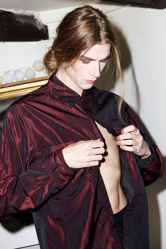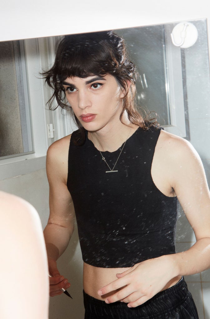 Apart from the fact that they are trans or non-binary, Ferrané says, these seven individuals are more predominantly linked by the fact that they are all young adults from the same generation living in Paris, with relationships to the worlds of fashion and art. Ferrané knew some of his subjects beforehand; others he met during the making of the project. He started the series with Mathieu, who we see carefully shaving his facial hair and putting on a rich red satin shirt and matching slick of terracotta eyeshadow. Ferrané met Mathieu when he came from the south of France to Paris to model for fashion week. “I found it interesting to present a person of this generation – who relies heavily on popularity and on social networks – in this intimate way.” He started taking pictures of Jackie and Raya at the same time, and describes Raya as a rising star of the fashion world and a “real figure of Parisian nights”.