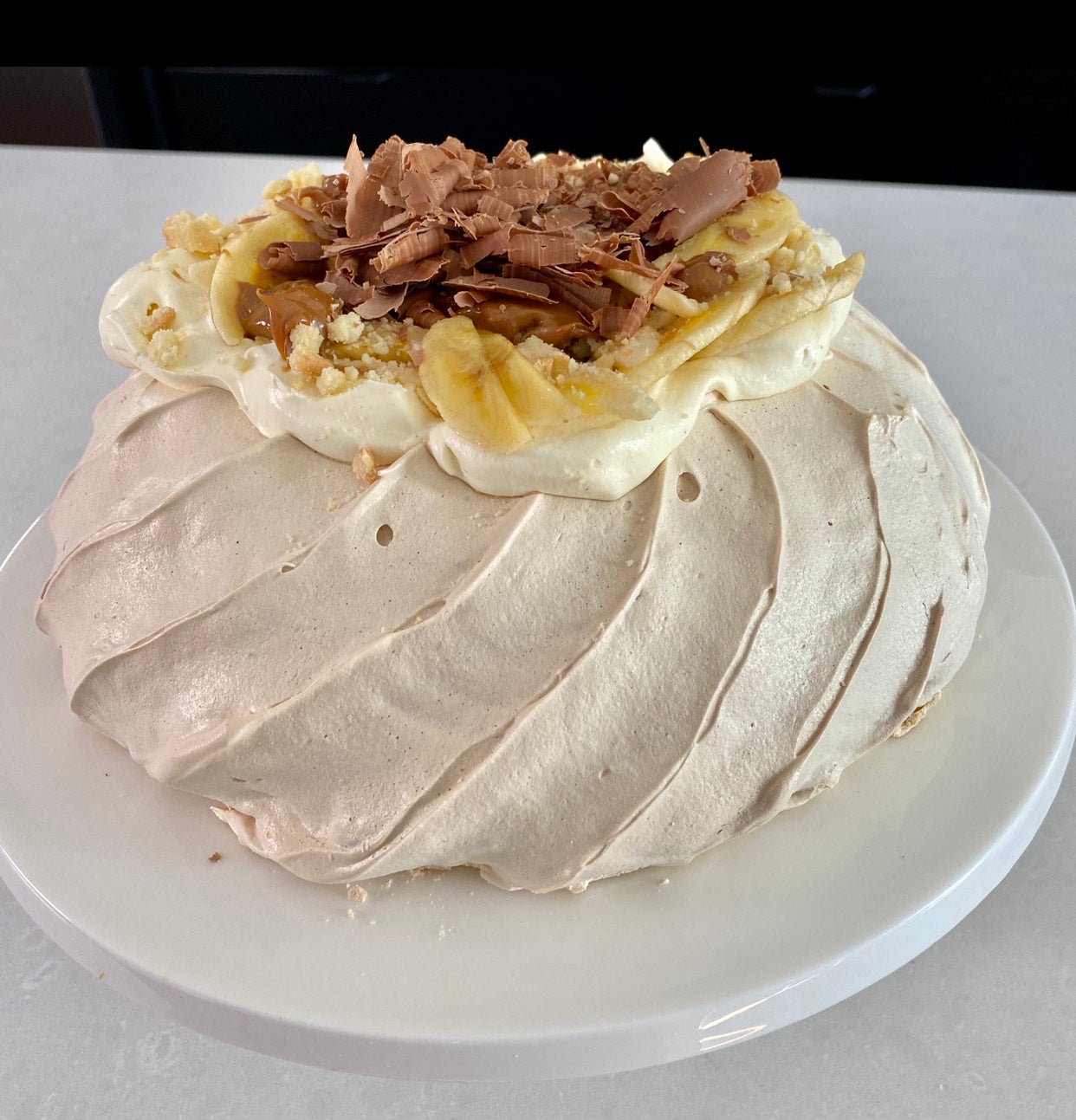 Crack the centre of the meringue, then start to fill the meringue with layers of whipped cream, caramelised condensed milk, shortbread crumbs and banana. Decorate pavlova with chocolate shavings.