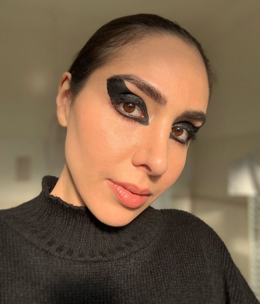 So where do you even start with a look like this? Excuse the pun but you just have to wing it. Using Pat’s liquid eyeliner, I began at the outer corner of my eye, scrawling a line up towards my eyebrow and fashioning a box shape. Though I’m a beauty obsessive, I’m not a makeup artist, so of course it didn’t go to plan. Whose idea was this? I wiped it all off using CeraVe’s Micellar Cleansing Water, £10, and started again. (There was no way in hell that I’d be messing this up.) Once I’d traced the graphic shape (and there aren’t any rules, so go wild) I had to fill in the negative space — probably the hardest part. My trusty eyeliner pen died on me halfway through so I moved on to Makeup By Mario Master Mattes Liquid Liner, £19. I’m not quite sure eyeliner pens are designed to colour in large areas and that failed me, too. I finished off the look with kohl and Kylie Cosmetics Kyliner Liquid Pen, £18. Yep, that’s four eyeliner products in total.