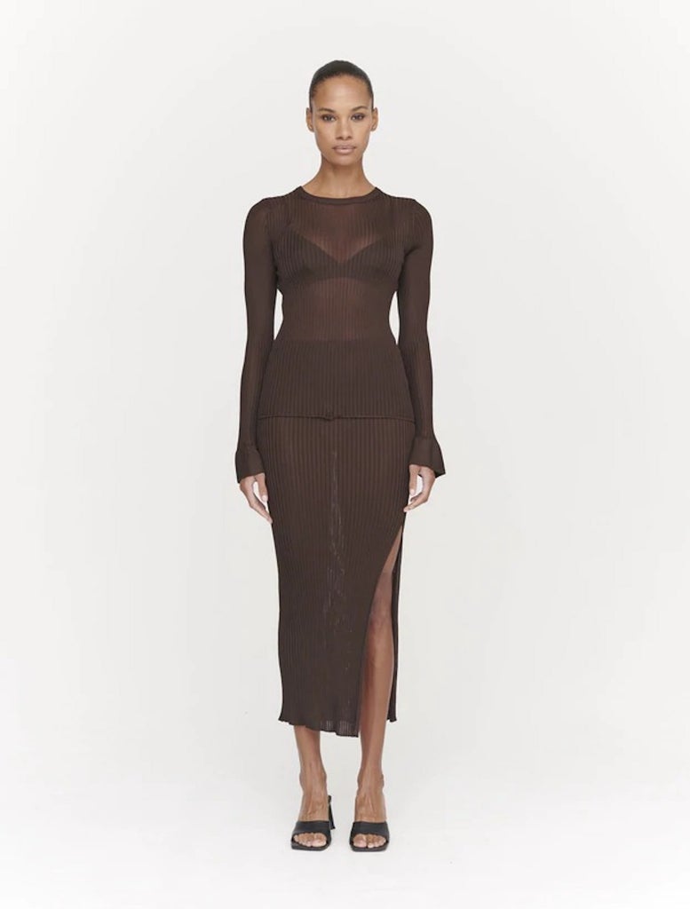 This sheer knit from London-based sustainable brand Ninety Percent is a great layering piece and when paired with its matching skirt is just chef’s kiss. Sophisticated and sexy, this chocolate number is going to take you (and me) places. Note how this look is effortlessly styled with black shoes, too.