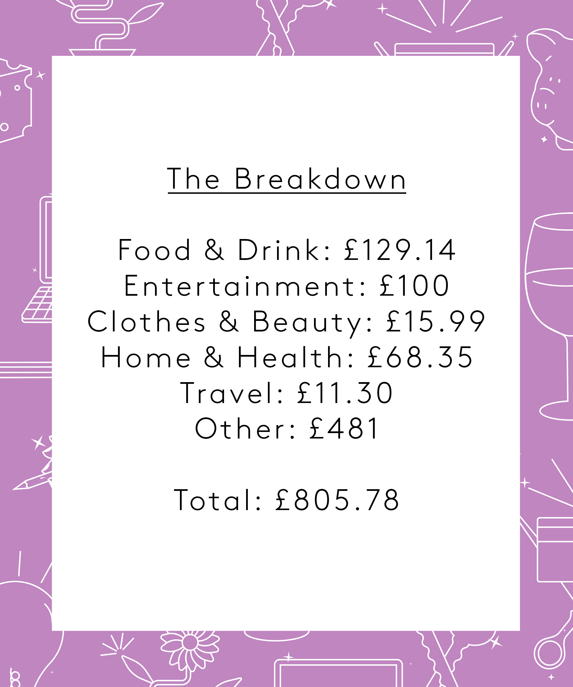 “This is absolutely shocking but I had a lot of payday outgoings included such as the hen do, paying off my credit card and the charity donation. If you ignore those spends, it’s quite reasonable I think. Working from home has saved me so much in commuting costs. I probably won’t change anything in the future, I think I have my finances pretty well organised. I also don’t usually drink as much as I did this week and won’t be drinking at all next week to compensate.”