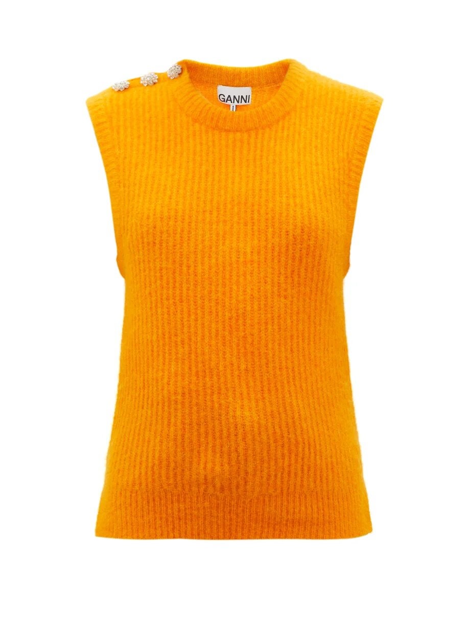Ganni Crystal-Button Ribbed Sleeveless Sweater, $, available at Matches Fashion