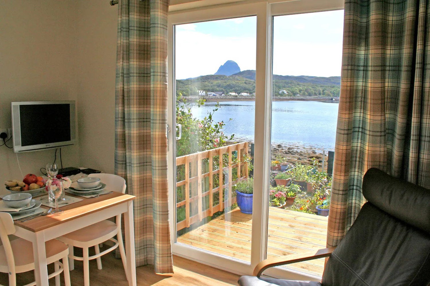 This cosy cottage is the stuff of staycation dreams. Perched on the shore of Loch Inver, the deck and small garden open up to stunning views of the water and Mount Suilven. Well-equipped for self-catering, the hosts also prepare for your stay with thoughtful touches like fresh flowers, produce picked from the garden, home baking and crockery from Highland Stoneware next door.