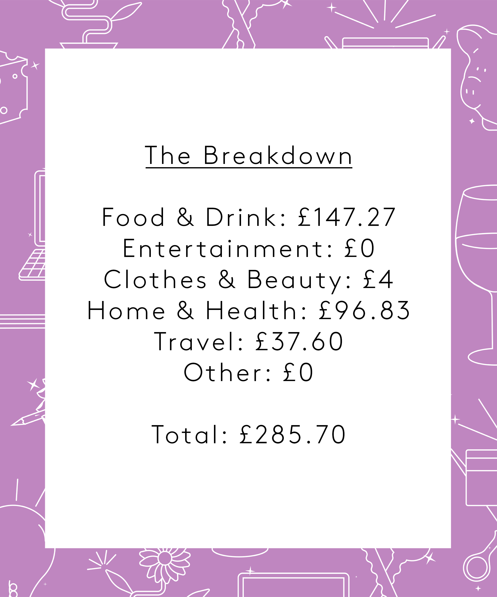 All other monthly payments: Phone and Apple watch £80, charity donations £10, £200 to my husband to pay his commuter club card each month as it was part of the negotiations when moving out of the city. £176.99 direct debit to pay down my credit card, which I then top up as much as I can during the month. £180 for my commutes to London (I decided to go into the office once a fortnight instead of once a week to keep costs down and my work is very flexible). Subscriptions: Spotify Duo £9.99.