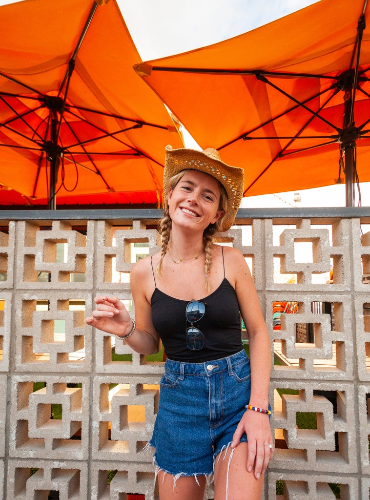 “What inspired this look is being in Texas. My hat is from a store in Texas, my shirt is Free People, my shorts are from Zara, and my shoes are Adidas.” — Margaret Fagel, 21