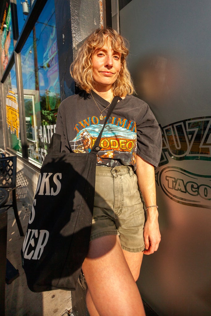 “I am short so I try to get help with my shoes. My pants are for utility because they have pockets. Shirt is to embody the Texas nature. A lot of Gen-Xers stop and talk to me about my watch so it’s a good conversation piece. My tote says ‘Books Is Power’ because I like reading and think it’s important.” — Genevieve Poist