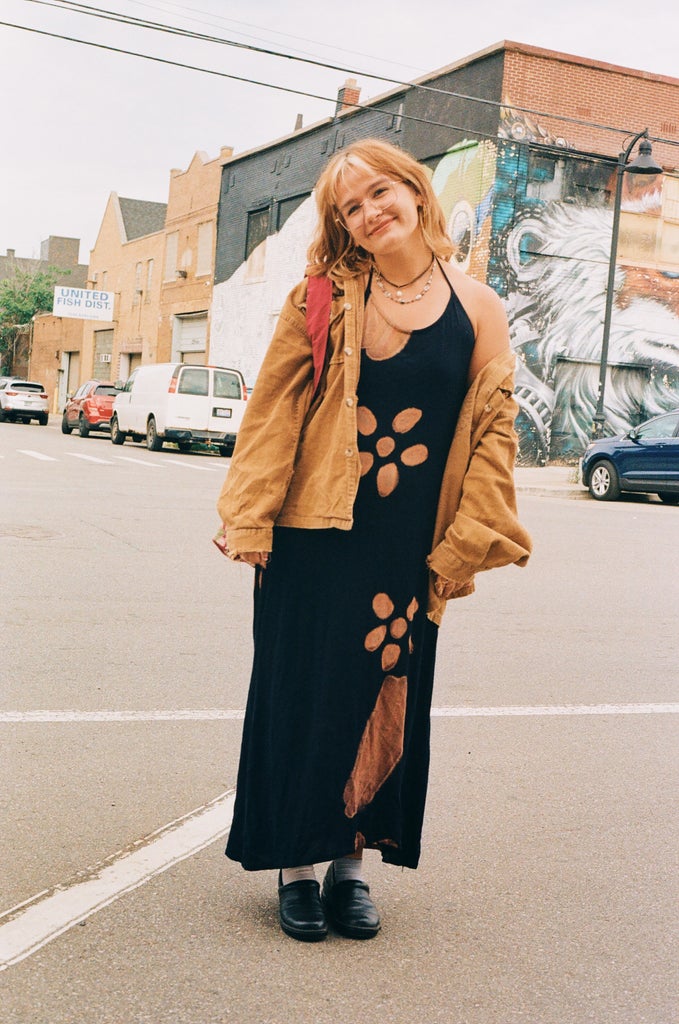 “I got this dress from my neighbour at a garage sale. She said she wore it when she was younger. It feels so comfy. I am into the browns. I like being comfy but I also like to look artistic. I like artsy grandma chic [aesthetic].” — Sophia Facione, 18, student