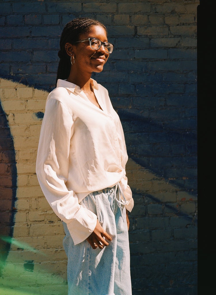 “I was probably inspired by Troye Sivan. I watched his house tour on Architectural Digest, and I was like, ‘I want that outfit.’ I really like big pants and a luxurious silk shirt. I just wear what I want, and it works out.” — Faith Ramos, 20, employee at Shinola