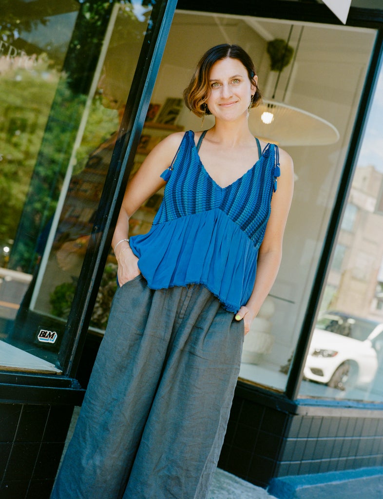 “It’s been really hot out, so having really loose-fitting clothing is ideal. But also, this top always reminds me of a trip to Spain with friends, so it holds a special place in my heart.” — Aimee de Simone, 35, owner of Berte