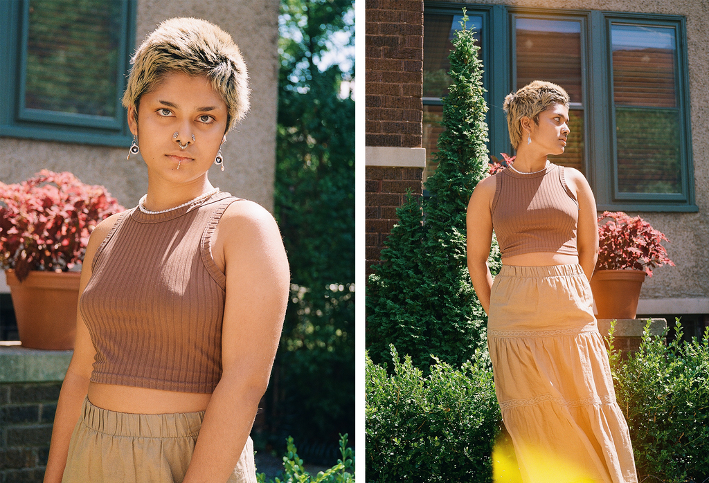 Hazel: “When I was little, [I wore] a ton of colours and patterns mixed together, or actual dress-up clothes. It’s been the main way I expressed myself for my whole life. For a while as a teenager, I simplified how I dressed to avoid judgment because I worried about what others thought about me and what I wore and if it was too weird or too feminine… So a lot of the time my younger self inspires me because they truly didn’t care and were just doing what felt fun and right.” — Hazel Bray, 23 (right)