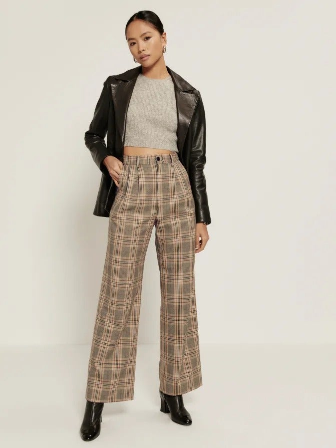 Leather is a material that never goes out of style and that applies to leather trousers, too. A dressier alternative to jeans, the style perfectly pairs with a chunky knit and knee-high boots for a casual-cool date night look. Petites should stick to a more fitted, high-waisted style to give the illusion of a lengthened leg.