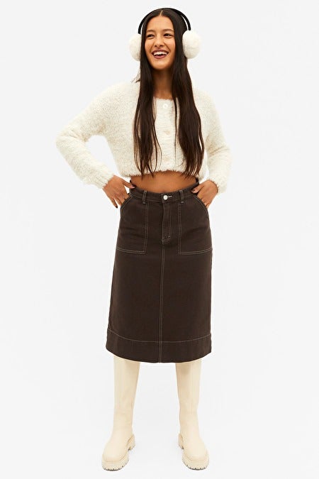 Kristine Romano, Associate Photo & Design EditorI’m not the biggest fan of wearing tights so I’m clinging onto my midi skirts before it gets too cold to wear them without an extra layer underneath. I love this chocolate brown iteration with the contrast stitching. Paired with a T-shirt, lightweight jacket and some boots, and you’ve got yourself the perfect autumn outfit.