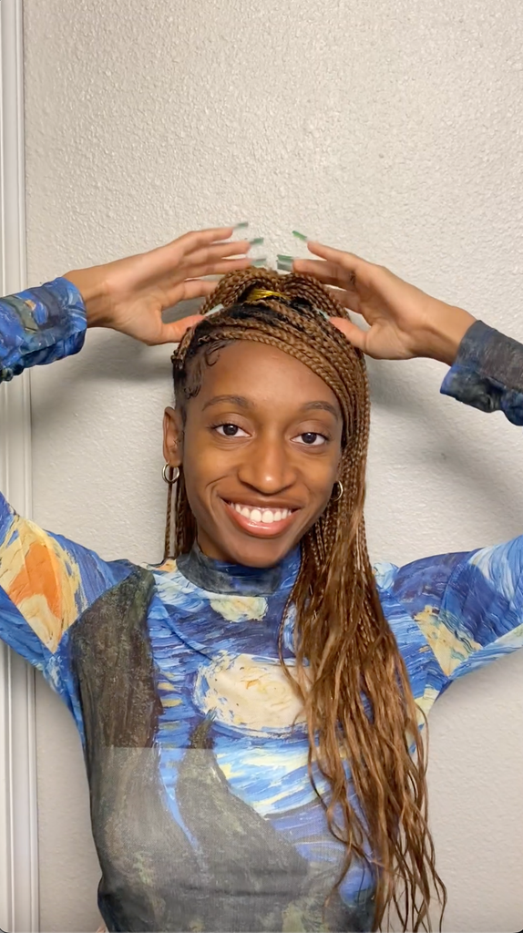 The styling will look different depending on your hair type. R29 social editor Breanna Davis braided her hair, sealed the ends with hot water. Then, she separated the front braids and pulled them to the side, secured the rest of her hair in a loose ponytail, and then tied both sections together to get that high and tight finish.