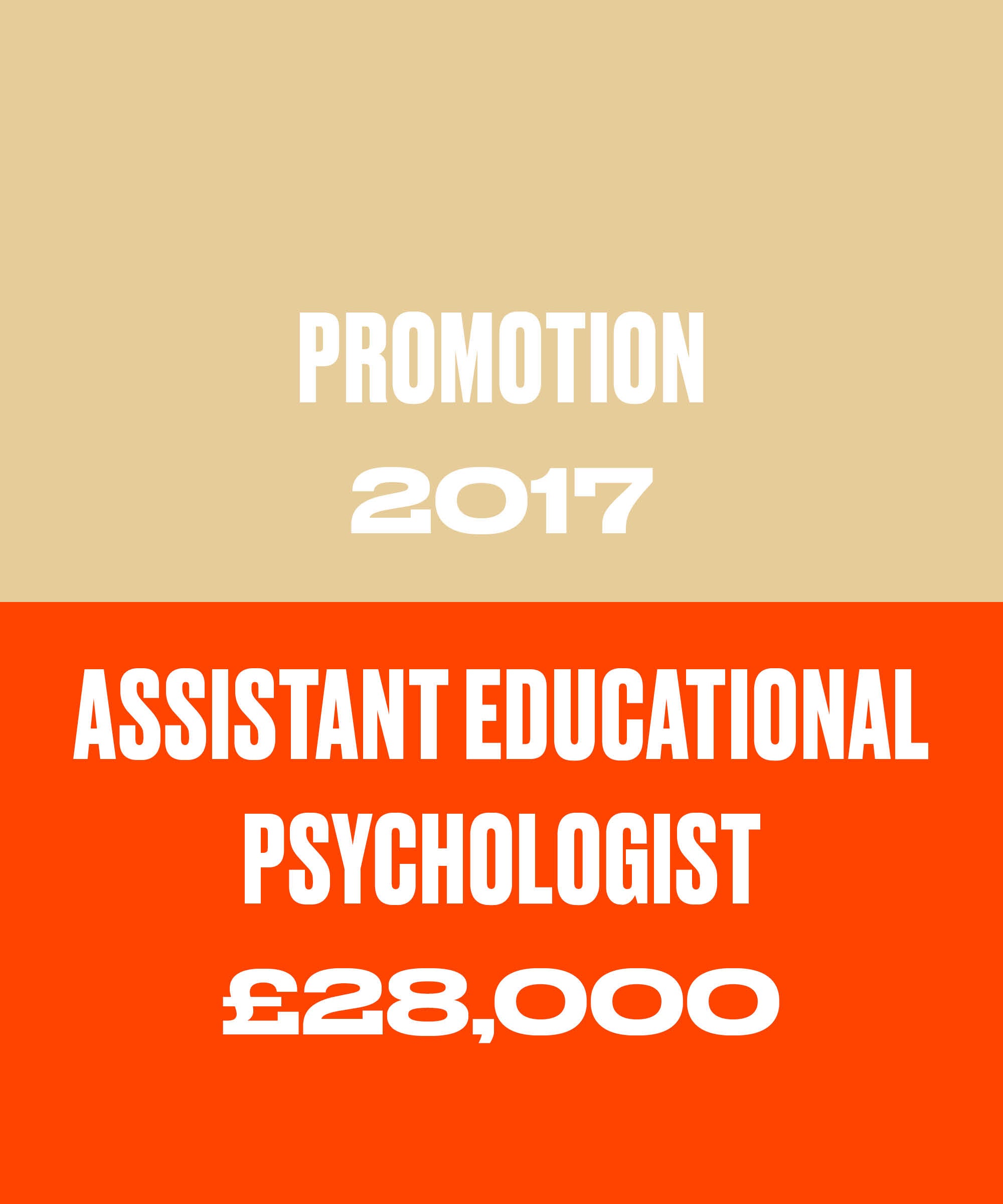 This was a promotion of sorts but without the pay rise! I was lucky to get a place on an educational psychology doctorate training course. The first year of training you are given a tax-free bursary (£15,000), which was a significant reduction from my assistant psychology position but also a significant step towards becoming a qualified psychologist. There are around 12 training places per year at a handful of universities and they have hundreds of applicants. Trainees don’t pay any tuition fees as these are covered by the Department for Education. Qualified psychologists have significant earning potential so it seemed worthwhile to me to take the pay cut to invest in my future.This was also a promotion of sorts. In the second and third years of training, your placement provider can either pay you a bursary as in your first year or a salary, which is what I managed to get. Not only was it a higher amount but it also came with the benefits of being employed rather than a student, such as pension contributions and continuing service. Upon qualifying with a doctorate degree, I accepted a position with the same local authority that I trained with and started straightaway on spinal point four, earning £45,000. This will go up incrementally each year. I also get 44 days holiday plus mileage allowance and professional registration fees reimbursed.
