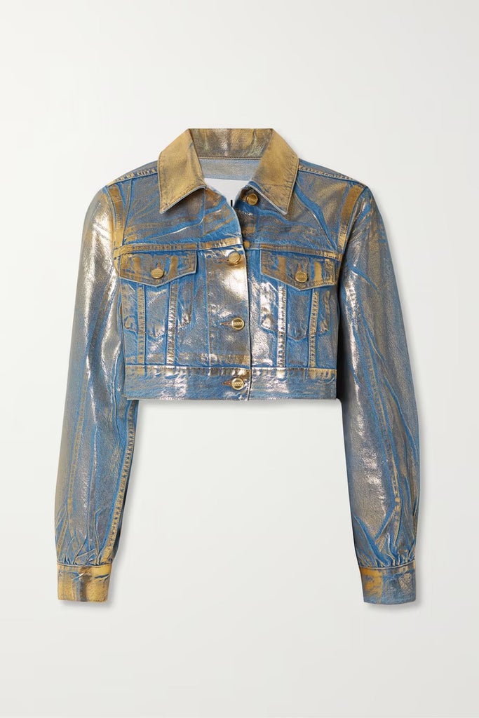 Demange is all over the resurgence of the cropped denim jacket but this time in a more chic setting than the school playground. “Throw this over a knit jumper and jeans during the day, and a mini dress at night,” says Demange of this statement Ganni jacket. Even if you prefer something a little less reflective, cropped jackets are another great way to get your double (or triple) denim on.