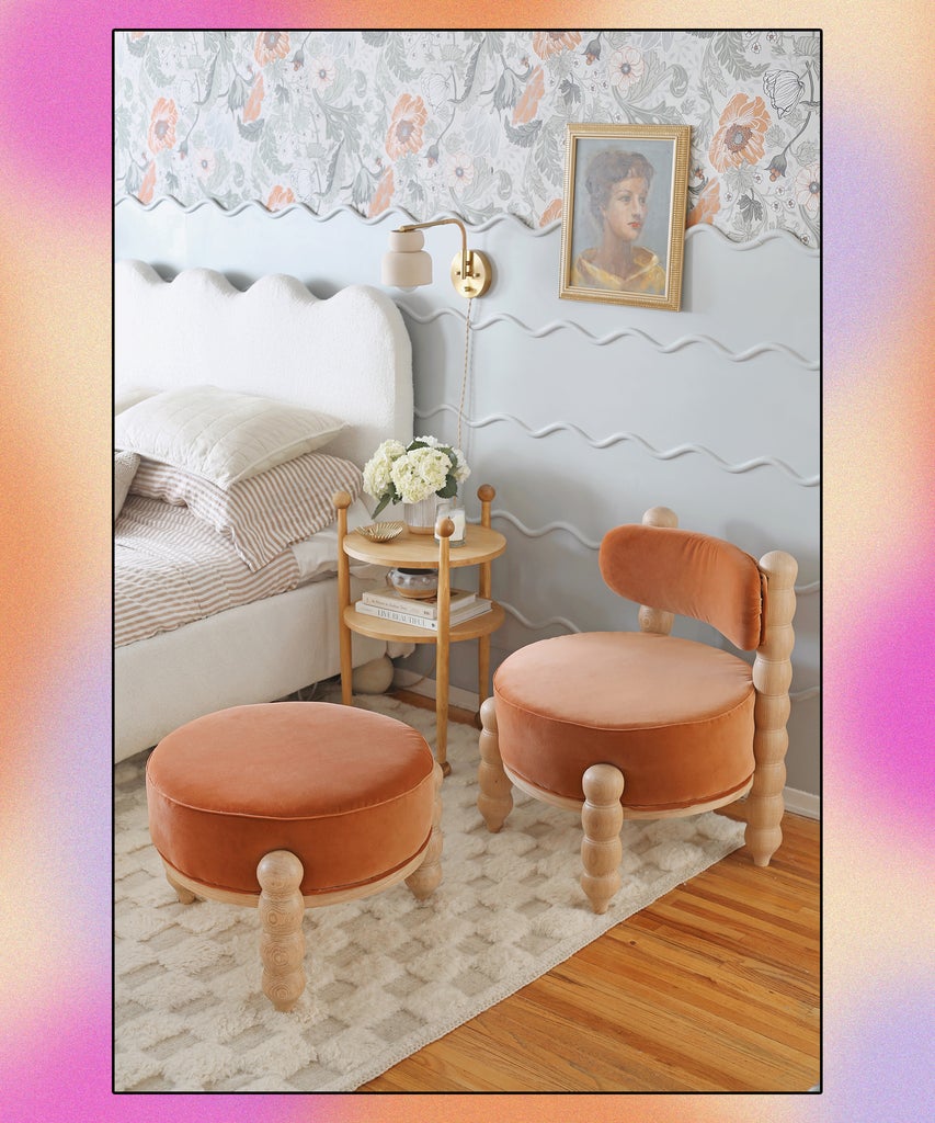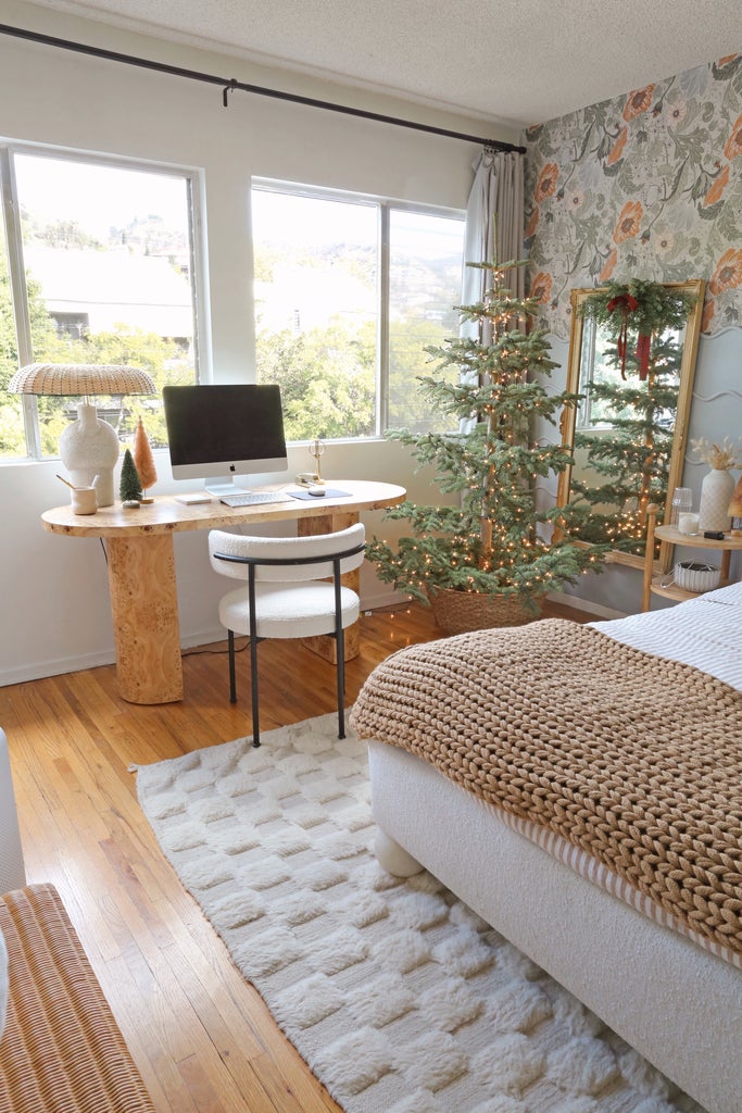 While many of Moreno’s furniture and decor pieces are bespoke creations from her (shockingly affordable) DIY projects, select investment pieces were ones she splurged on in-store. “I fell in love with this burl wood desk, which was $899,” she says of the beloved CB2 piece in the primary bedroom.