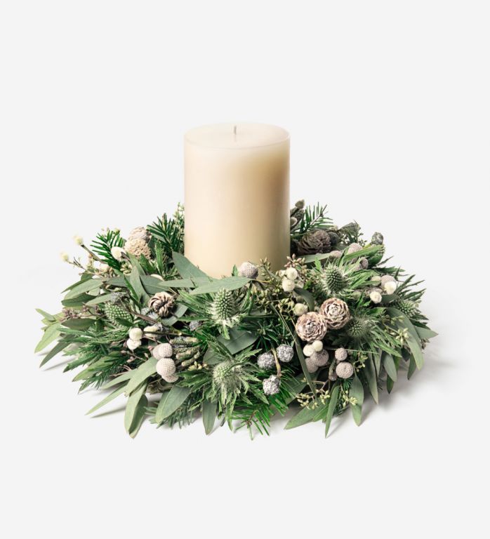 We love the look of a wreath runner but if your table is too small you can capture the same feeling with a miniature wreath centrepiece. This one from FLOWERBX is handmade in London with Douglas and noble fir, eucalyptus, pussy willow and alpine cones.