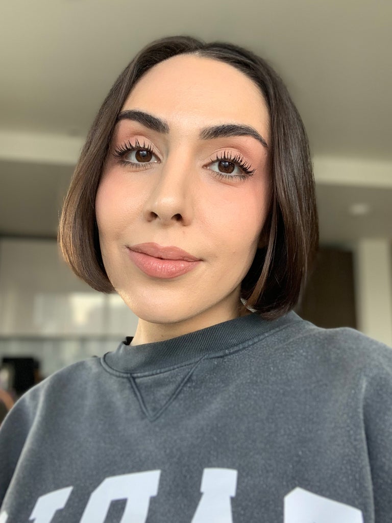 I’m a big fan of blush, namely Jones Road The Best Blush, £26, which is velvety and so pigmented that you only need a dab. I flit between shades Berry (a deep pink) and Peachy (a baby pink) but I thought I’d opt for the latter so as not to go overboard. The key is to apply your base makeup first but avoid mascara, eyeshadow or eyeliner so as not to smudge anything. Meg and Avonna use a large, fluffy powder brush but this is where I encountered my first issue. I found that this wasn’t precise enough and I ended up catching the sides of my nose with product.