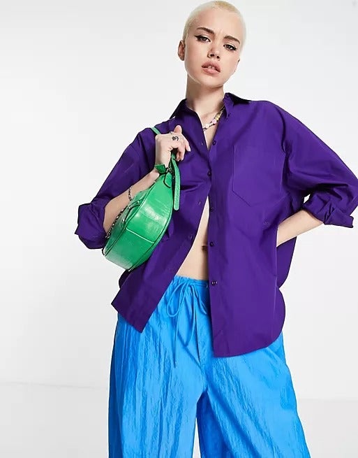 JJXX Jamie Oversized Poplin Shirt in Purple, $, available at ASOS