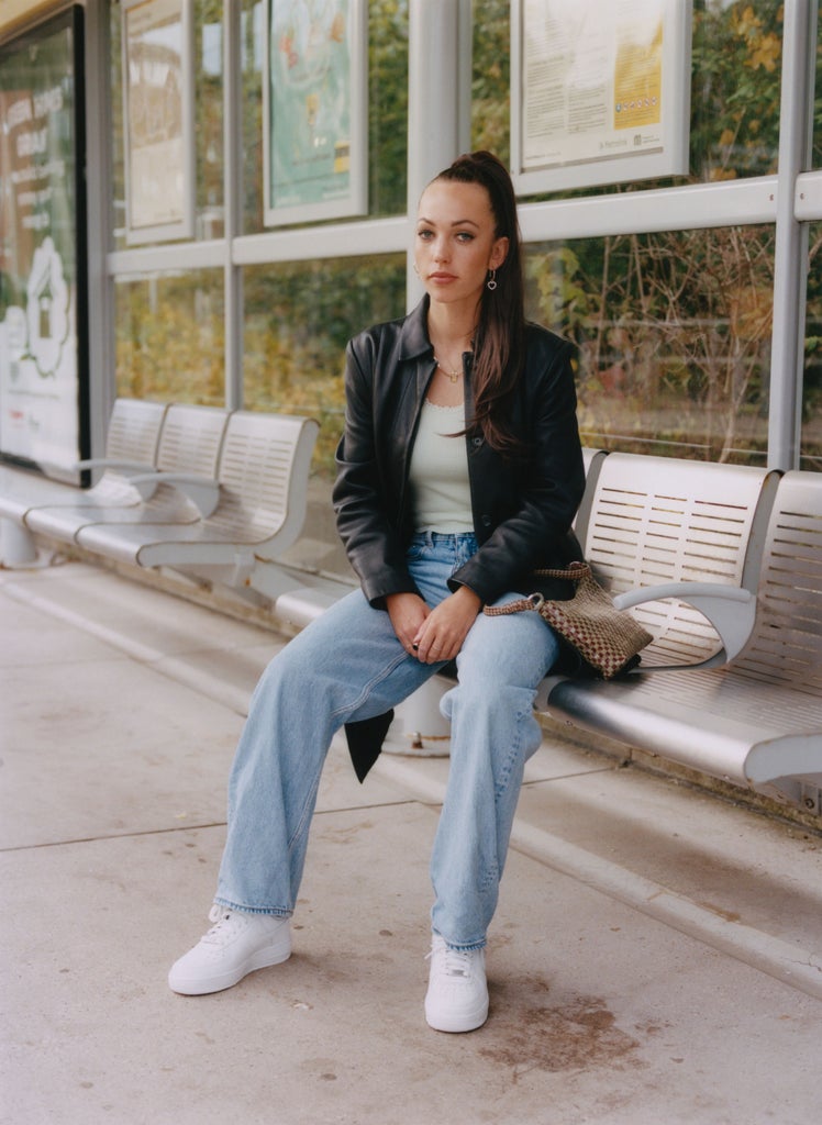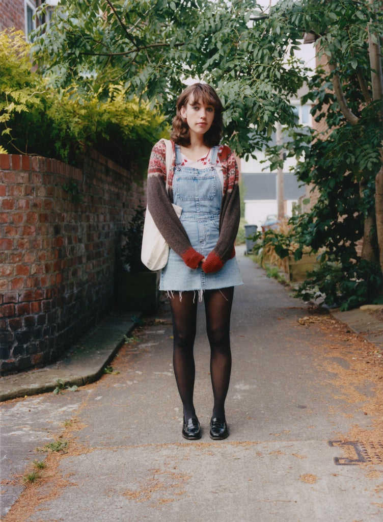 “This is probably the closest to how I looked in 2007/2008 – it really threw me when I got the photos back! I realised I was holding myself differently in the photos, too – the hands curled up in the jumper and the awkward slight smile. I think the dungarees and the tote bag were important. I never had a proper bag when I was at school, always a tote bag full of stuff I didn’t need which I’d use until it basically fell apart. Alexa Chung and Alex Turner were together when I was a teenager and I remember thinking they just both looked so cool. I find it kind of terrifying that ‘indie sleaze’ is coming back. I nearly did a look that was more new rave/indie sleaze but I couldn’t quite bring myself to… Everyone just looked so bad?!”