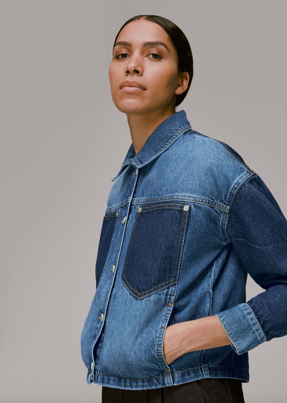 Whistles Ella Patchwork Denim Jacket, $, available at Whistles