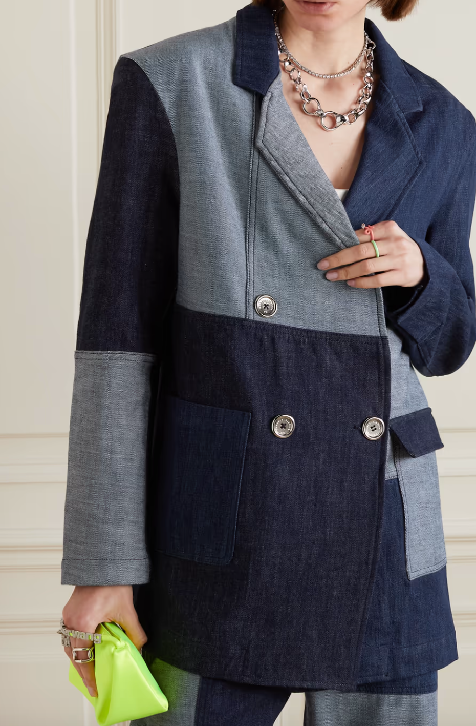 Emhoff is by no means alone in her enthusiastic embrace of the patchwork denim jacket as a top jean trend this season. From Copenhagen to Paris, the industry’s most à la mode show attendees have been sporting outer layers in multiple tones of fashion’s favourite fabric in the form of cropped coats, and even quasi-cardigans. Add to that the influence of celebrities like Julia Fox, who is known to dabble in kaleidoscopic denim, and it’s no wonder the patchwork denim jacket has become a top-searched term among cybershoppers scrambling for outerwear that’s bigger, bolder and bluer.
