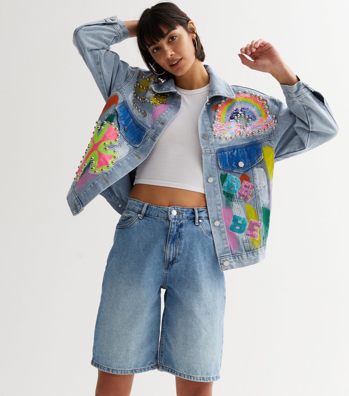 New Look Cameo Rose Bright Blue Patchwork Paint Stud Denim Jacket, $, available at New Look