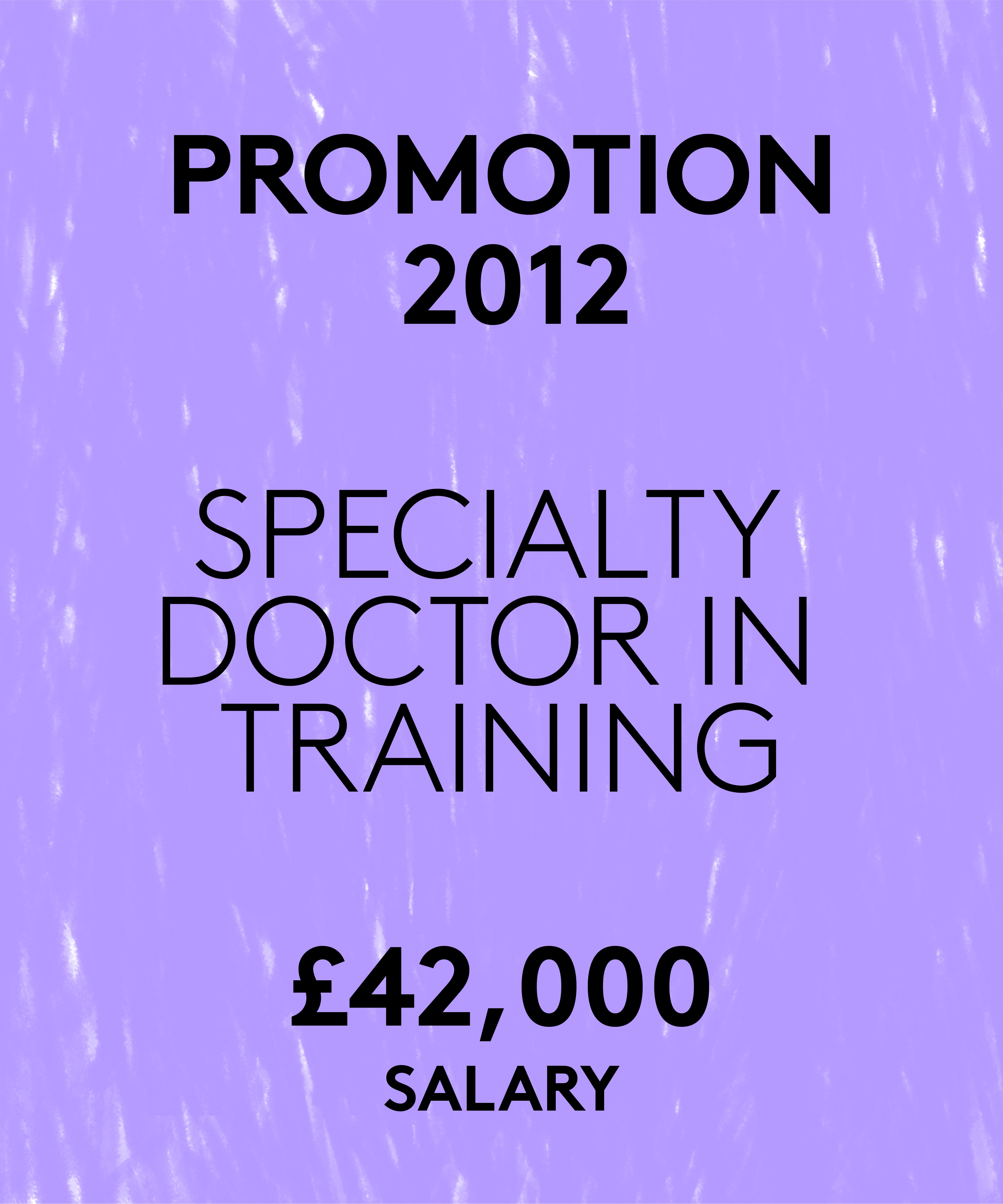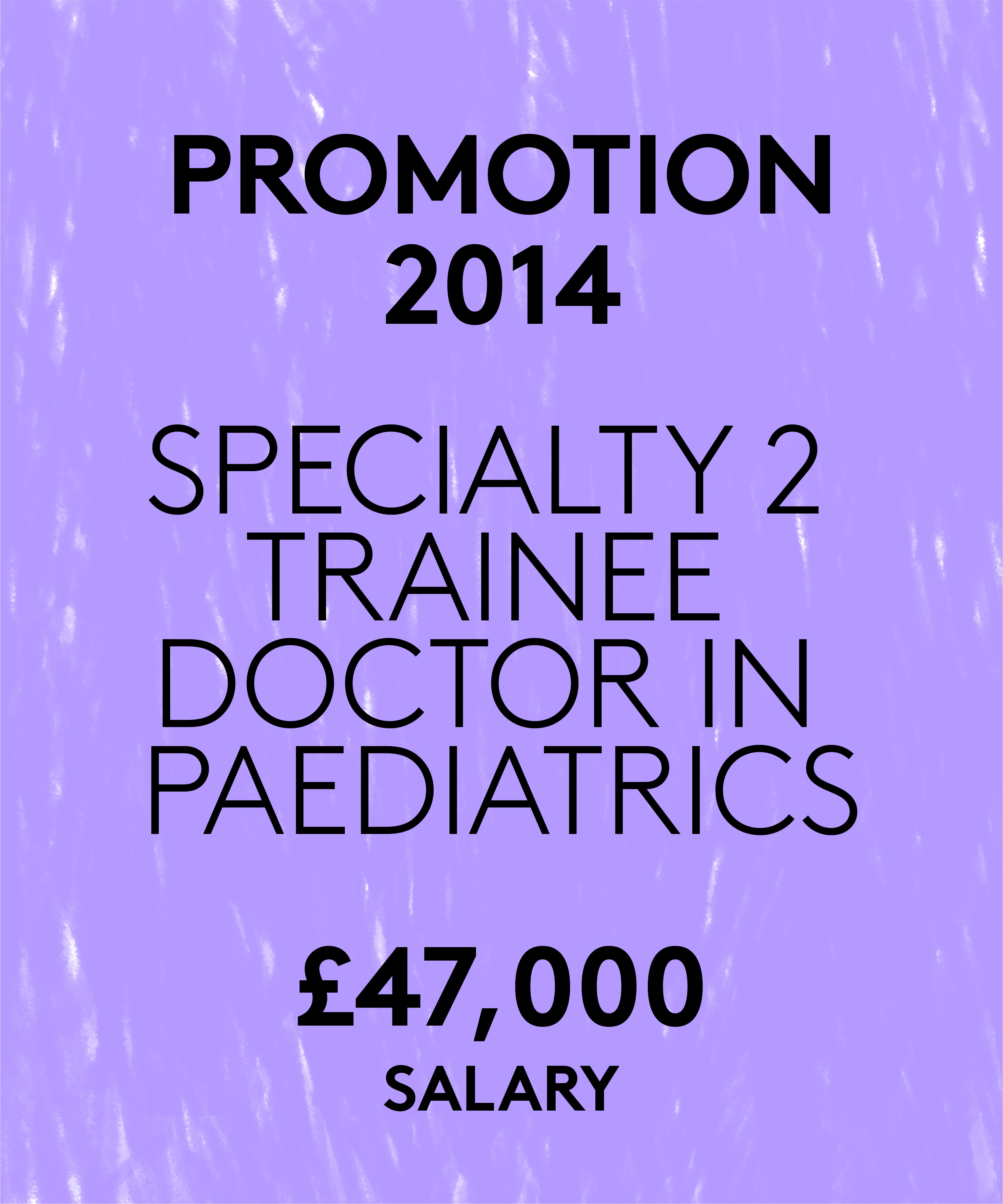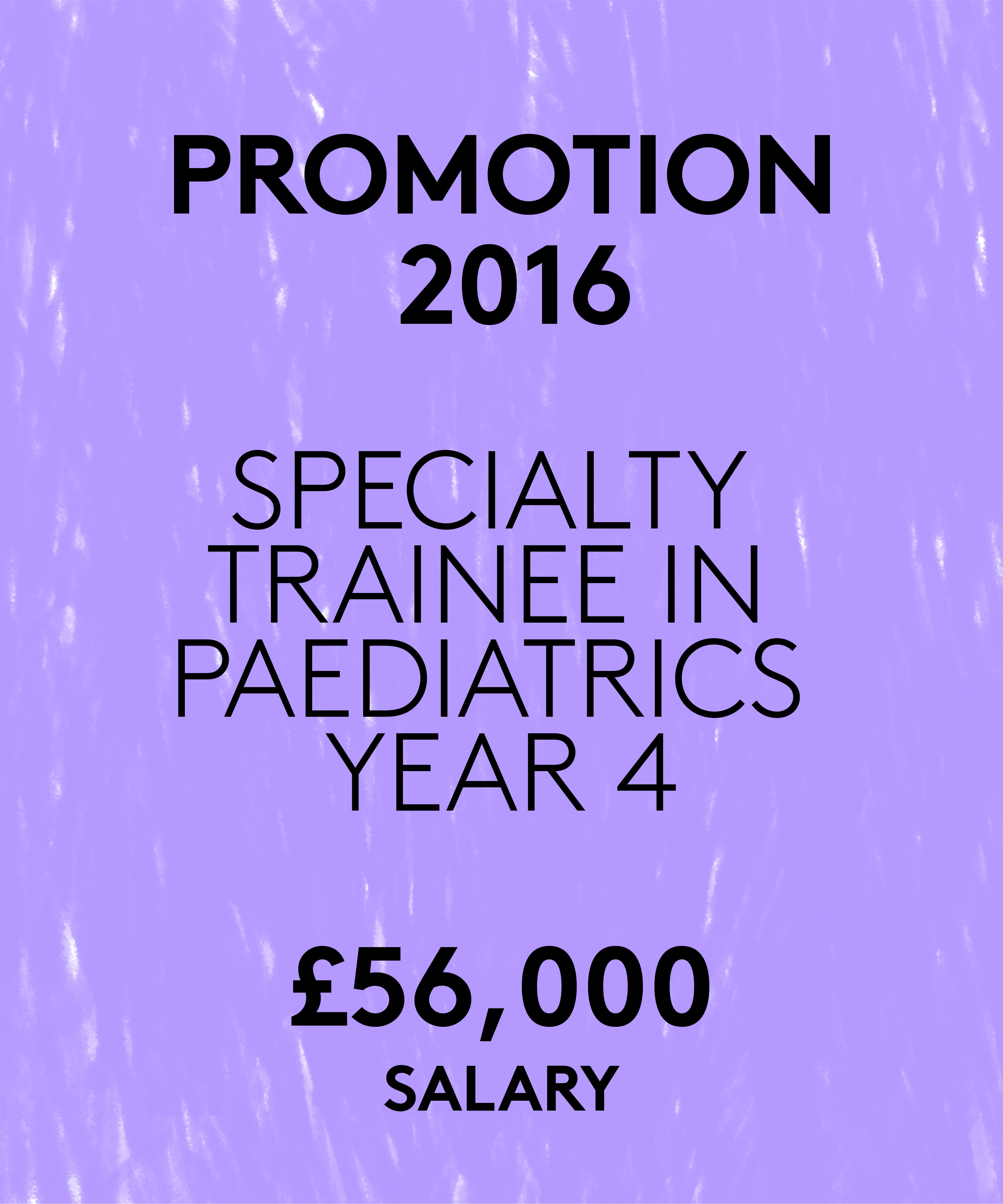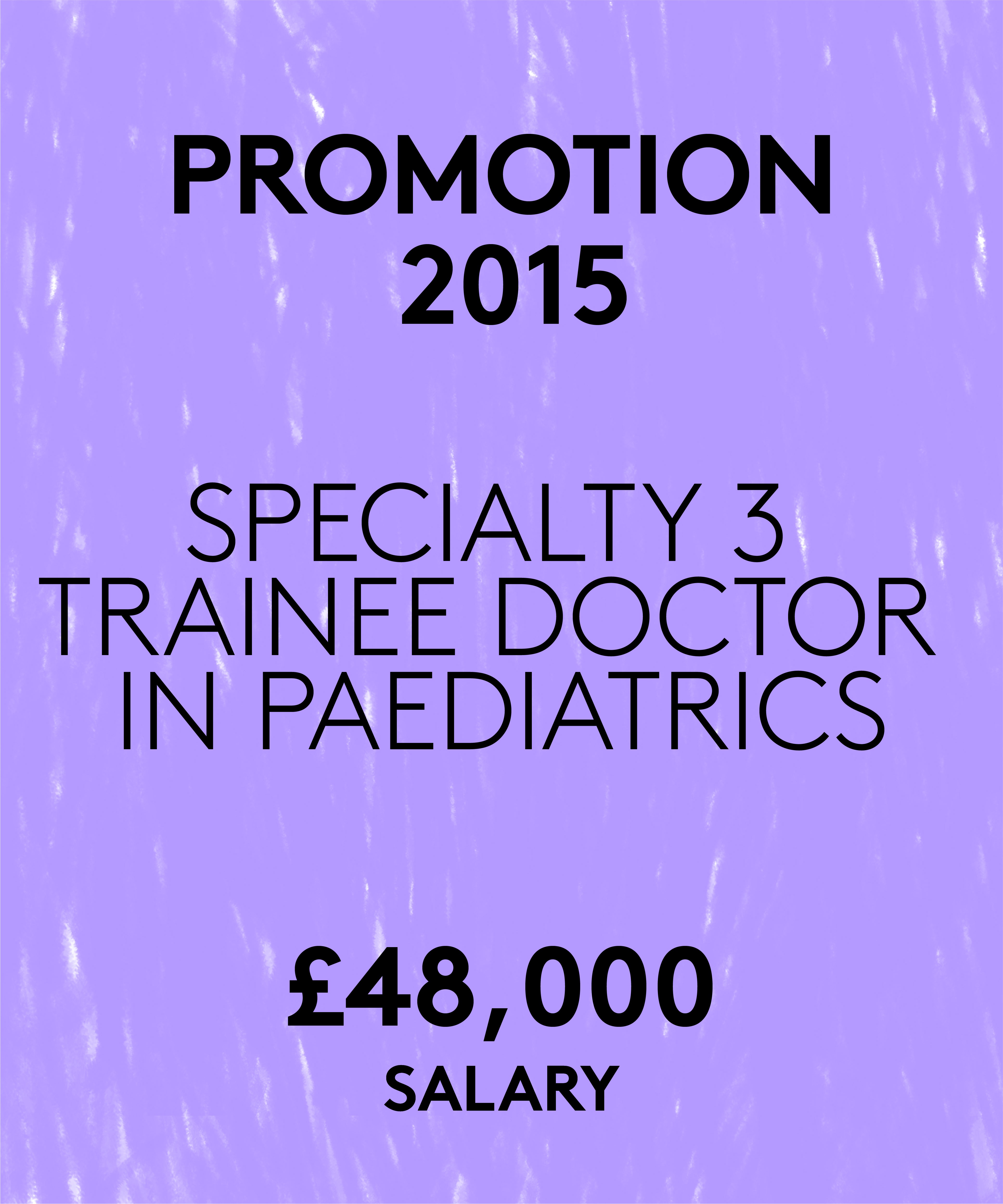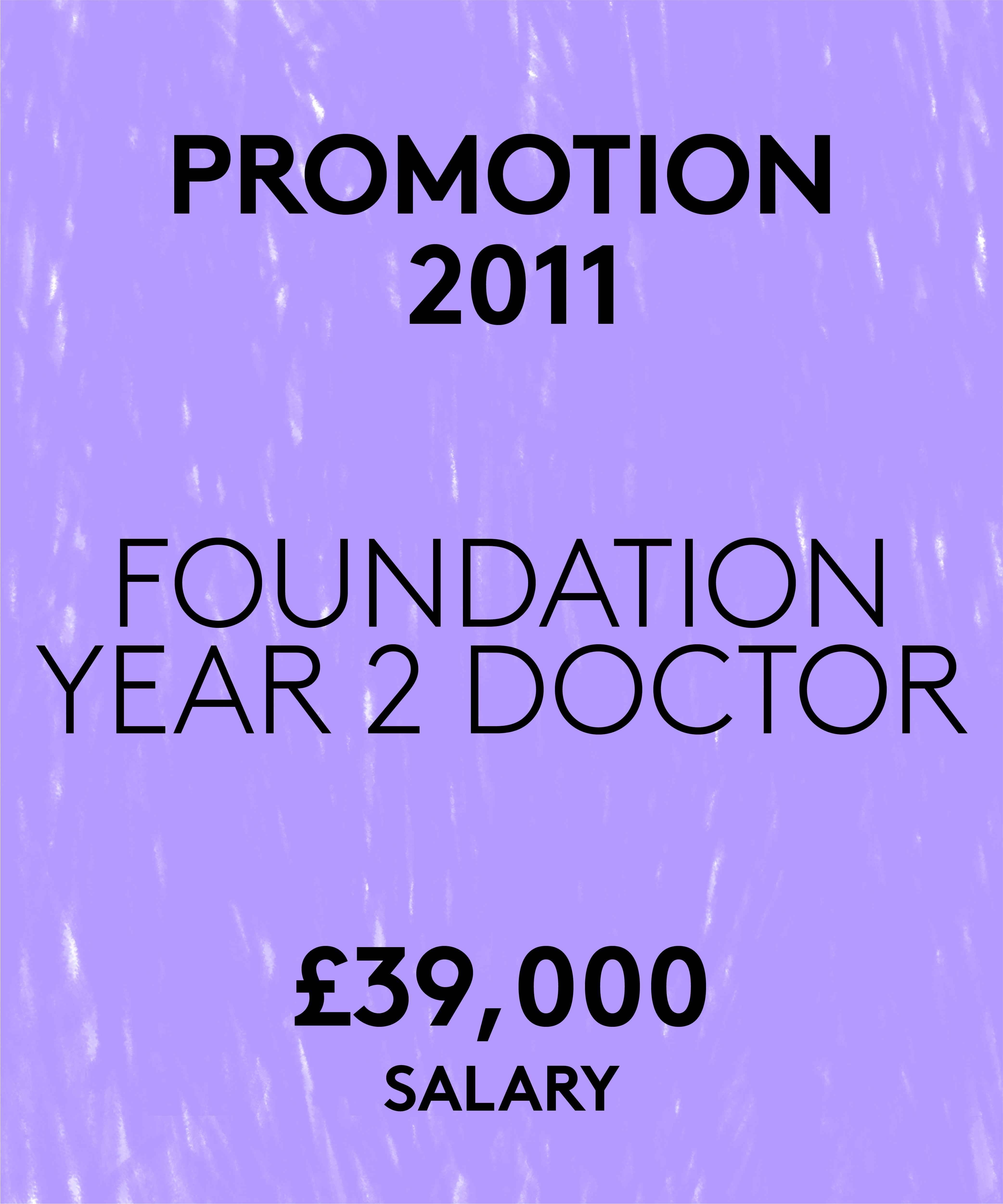 Starting salary: £21,000 in 2010. I was straight out of university, having studied for six years. I was a foundation doctor so doing all the jobs of a doctor on medical wards, surgical wards and in paediatrics but at a basic level, with many people above me to ask and defer to when needed.
