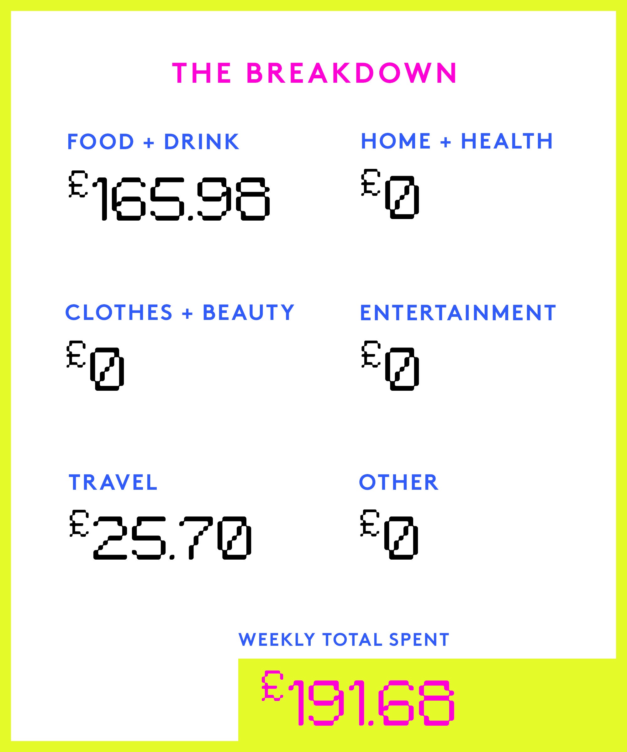 “All in all it was a good week, although definitely more expensive as I had my girls’ catch-up. We usually meet up at least once a month and go for a nice dinner and a few drinks, which can sometimes set me back £100+. As I expected, most of my spending is on food. I think I have to be more conscious of eating out, especially now with a mortgage. When we move into the new place, we can have our friends over more often rather than eating out so hopefully that will help me save a bit more.”