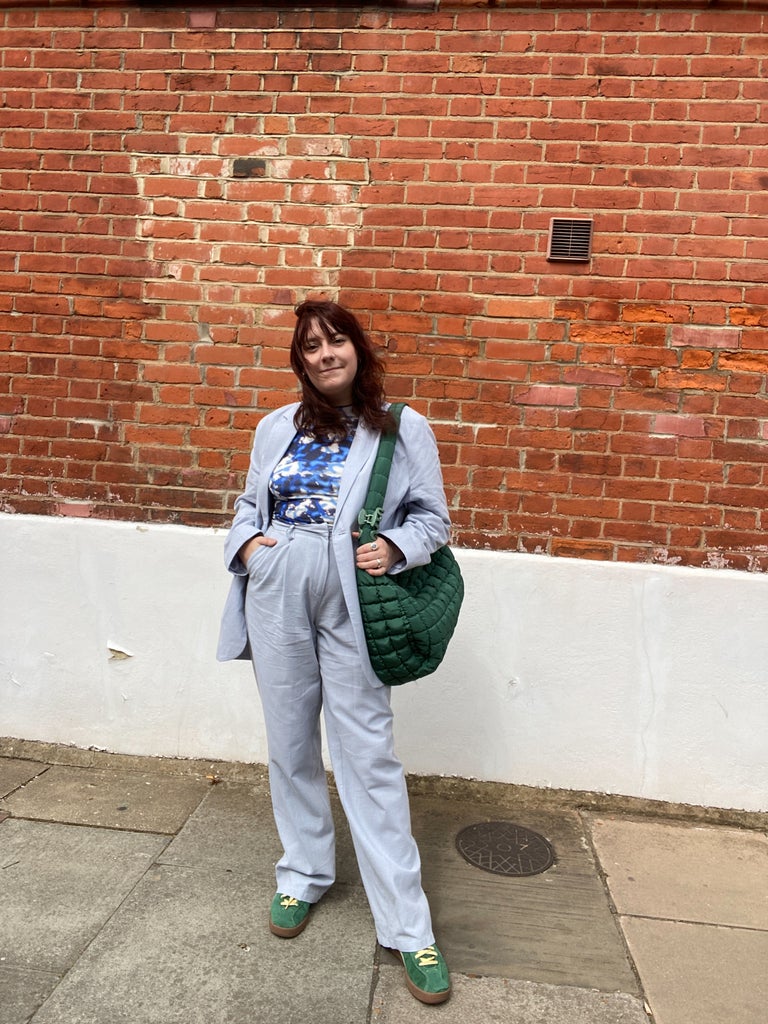 I opted for a simple, linen-blend suit in a pastel blue, paired with a watercolour print top. As I work in a more relaxed, creative office, I finished the look with green trainers and a matching, padded carryall. If you need to dress more formally, then silver closed-toe ballet flats and a simple leather tote are a great bet. The best thing about this outfit is that you can rewear and rework it all summer long: swap out the top, incorporate just the trousers into various looks or wear the blazer over your favourite work dress. Linen is also perfect for stifling summer commutes.