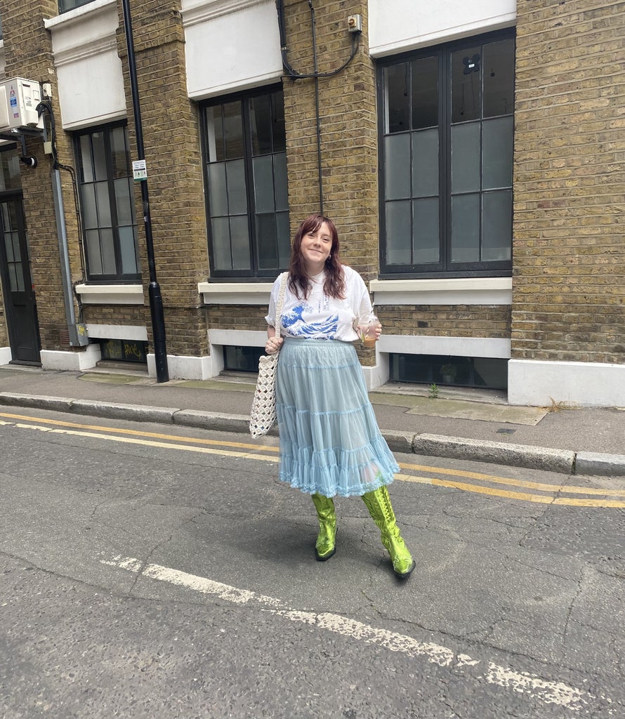 This outfit is for a slightly more dressy weekend occasion: brunch, drinks or dinner. Have fun with your styling — more layers, more accessories, more nods to your aquatic theme. This frothy dream of a skirt captures the flow and movement of the sea; I paired it with a wave-printed graphic tee (naturally), a crochet bag covered with pearls (duh) and ultra shiny, metallic green cowboy boots. If I can’t have a real-life mermaid tail, then this combination will suffice. It’s also a lot more practical for running around the city and jumping on and off night buses, feeling a little tipsy.