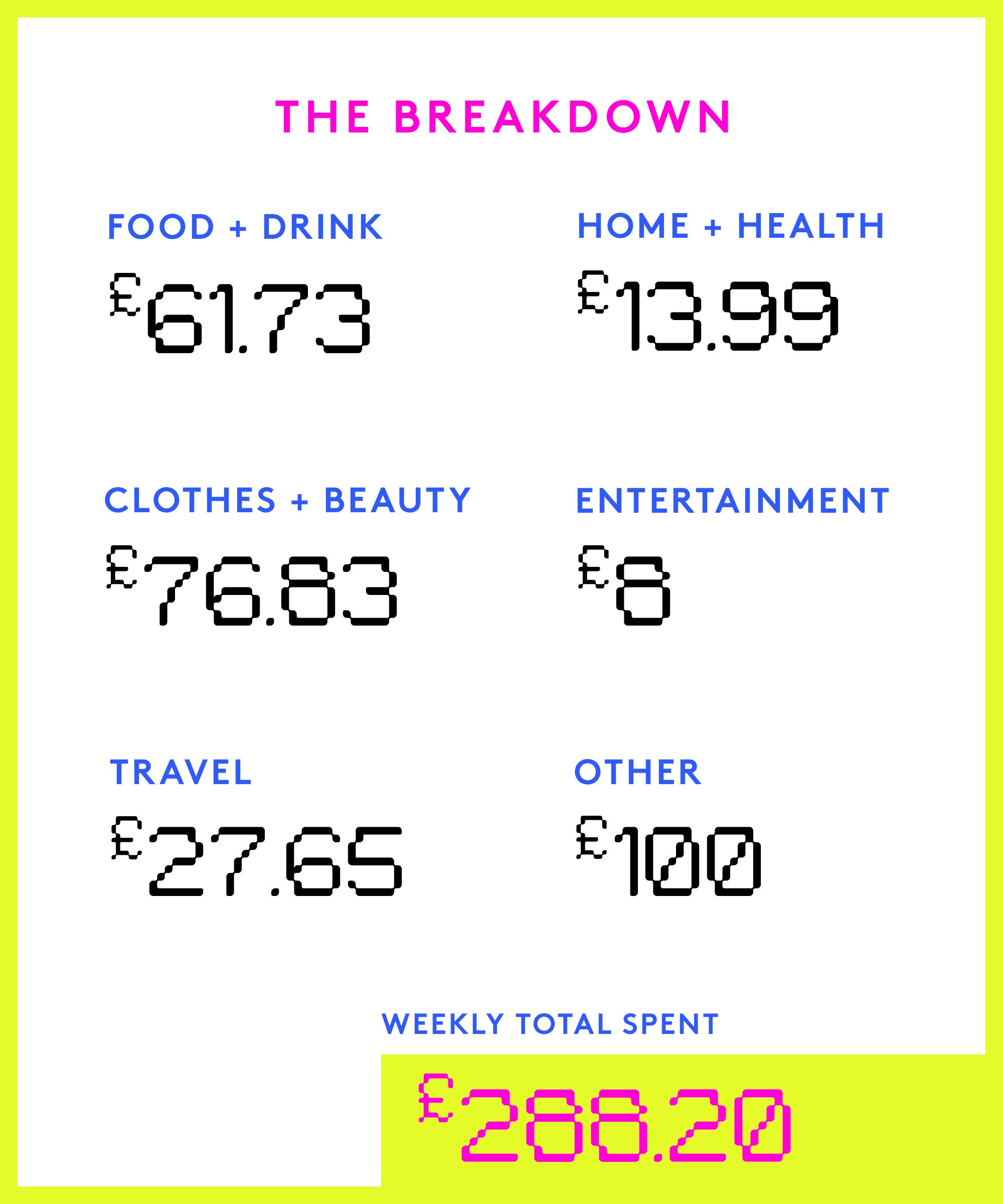 “It’s quite difficult to say whether this is a typical week for us as I’m just getting into the groove of returning to work full-time and being a mum. Normally I wouldn’t spend so much on skincare but I guess these products will last me a few months. In the coming months we expect our weekly expenditure to increase as we make plans for finally getting round to decorating our house and making it feel more homely.”