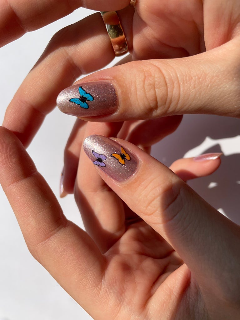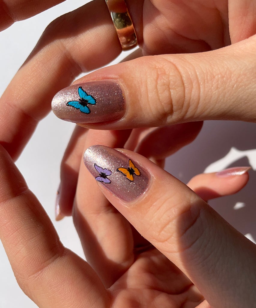 Jess predicts that nail stickers are going to become more mainstream as brands are figuring out how to make them look less like a sticker and more like professional nail art. “I love nails stickers,” Jess raves. “You just stick them on and put a top coat over them.” Here, Jess used a rose-gold polish for a base, butterfly nail stickers from Deco Miami, slicked with top coat. The trend: easy application. Also try Mylee Golden Leaves Nail Art Stickers, £2.