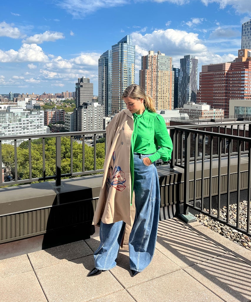 To prove that baggy jeans can work for any occasion, I wore the Sids for a week straight. The result? A regular spot in my capsule wardrobe rotation. While my pair, in classic blue, is currently sold out, you can find the look in black, as well as ivory colorway; leather fabrication; and acid and bleached washes. Ahead, how to style the wide-leg denim trend for fall.