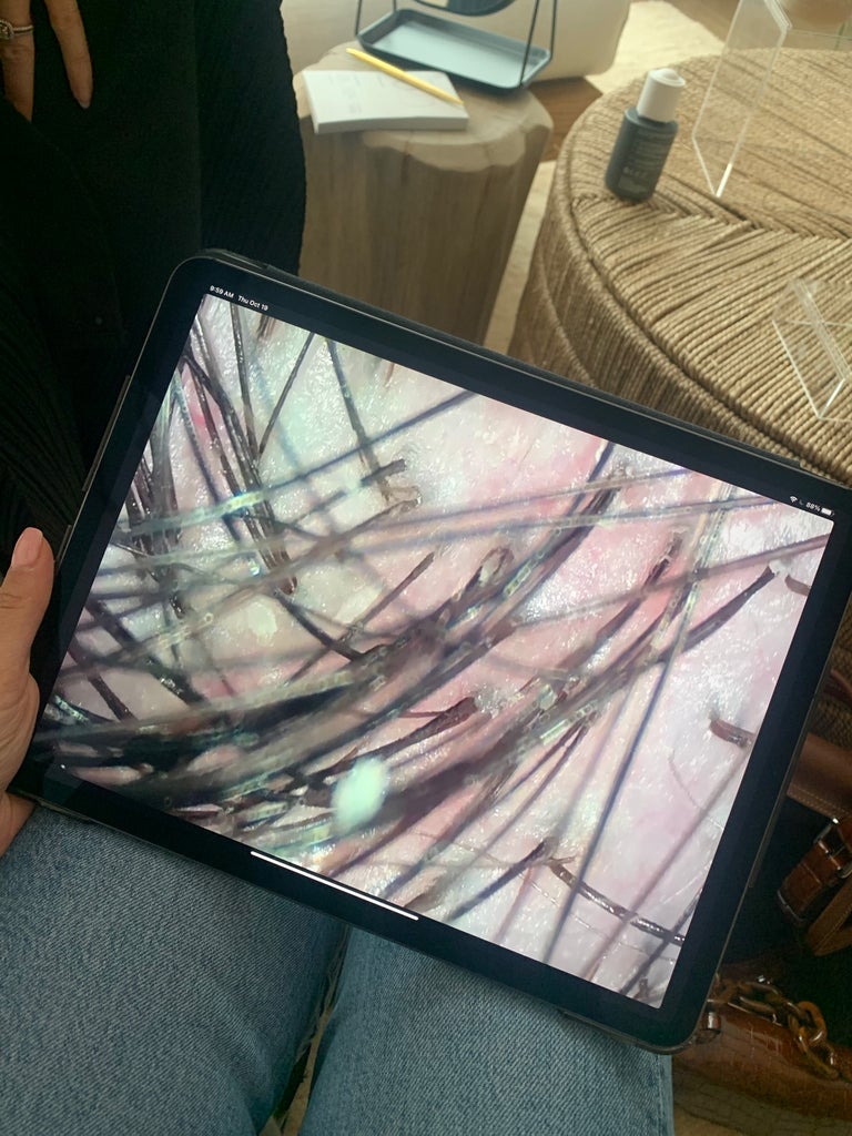 Having a microscope on your scalp is confronting. It’ll show you the precise areas where you haven’t washed your hair properly and exactly where your strands have broken off as a result of forgetting to apply heat protection spray. I knew my scalp would be flaky, but I was shocked to see how red, inflamed and oily it looked. That’s when Reavey made a diagnosis of seborrheic dermatitis.