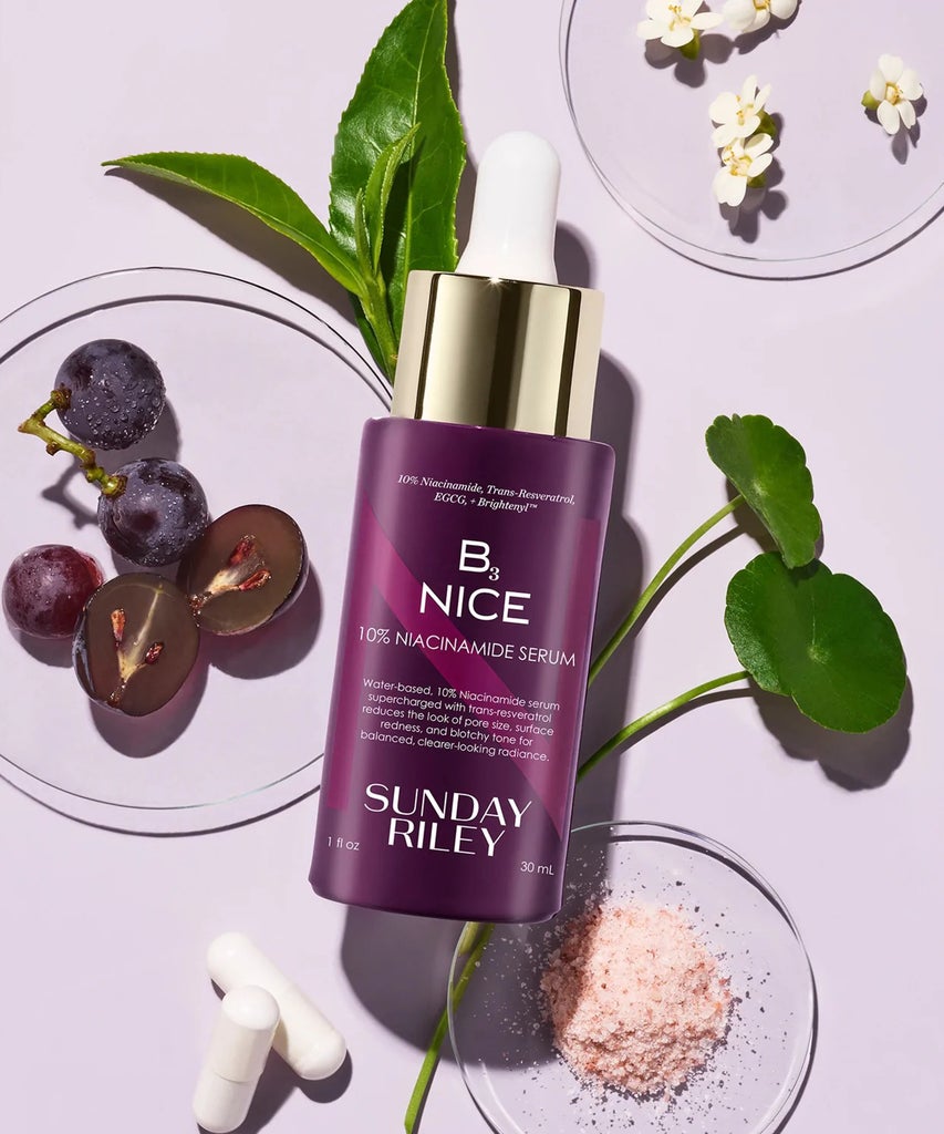 Sunday Riley is encouraging us to be good, both to ourselves, of course, but also to our skin, and it’s all thanks to the brand’s latest launch: B3 Nice 10% Niacinamide Serum. I’ve gone back and forth with niacinamide for years, as the skincare ingredient has countless benefits. Niacinamide is a form of vitamin B3, which helps hydrate, calm and brighten skin. Niacinamide can improve excess sebum production (overly oily skin), minimise the appearance of large pores, protect the skin barrier and reduce redness, as it’s also anti-inflammatory. It can be used on its own, or alongside a number of different ingredients. (Niacinamide and retinol are like the cool kids in school who aren’t dating, but they’re not not dating. That’s how well they work together.)