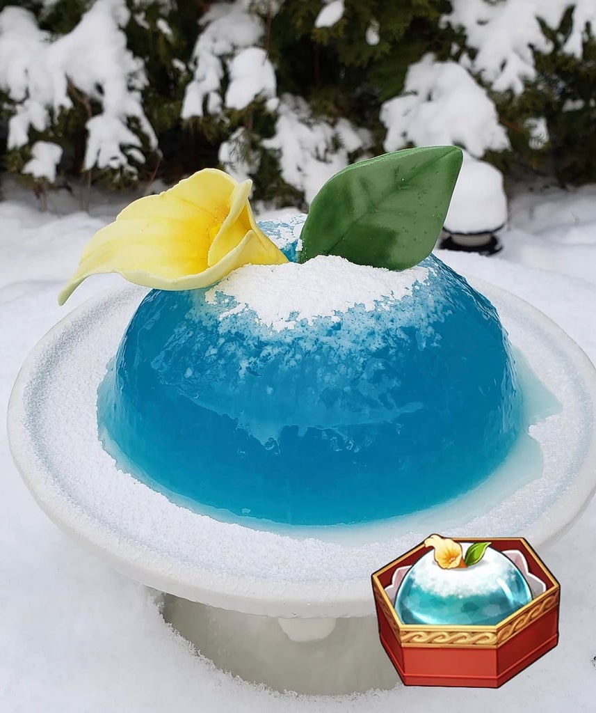 Sugar-frosted slime is an item in Genshin Impact obtained upon completing a quest. While it isn’t an actual dish that can be cooked in game, it’s widely loved by players, including Estero. It may look effortless, but the garnish takes a bit of work. Estero used her mother’s teachings by working with fondant to create the flower and leaf. Adding striations to keep it realistic, she then used edible dust and gold to add depth to the flower and leaf.