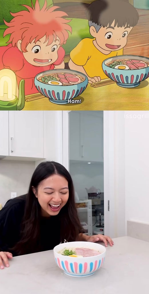 Whether it’s feeding Calcifer (the resident fire demon from Howl’s Moving Castle) leftover eggshells, or creating a striped ramen bowl just like Ponyo’s from its eponymous film, Estero’s content is perfect for someone looking to watch live action remakes of their favorite anime food scenes. Not only does she emulate the anime as closely as possible, such as yelling at ham in delight like Ponyo, she also includes detailed recipes in her captions.