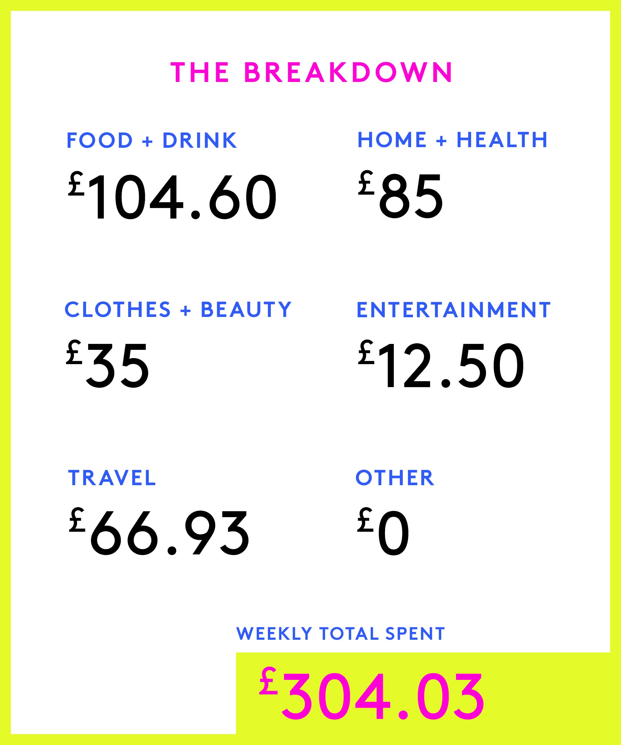 “This is pretty much what I expected. Having been mindful of my spending for a few years, food and commute costs are consistently my biggest expenses. In both areas I could cut down, either by planning food shops better or attaching my railcard to my Oyster, which I’ve been meaning to do for ages. Given my future is currently very uncertain, I’m trying to find a good balance between socialising and saving. I’m really enjoying being single and living alone, even if it means I’m paying the ‘single tax’ in London for housing and bills and I will continue to prioritise that.”